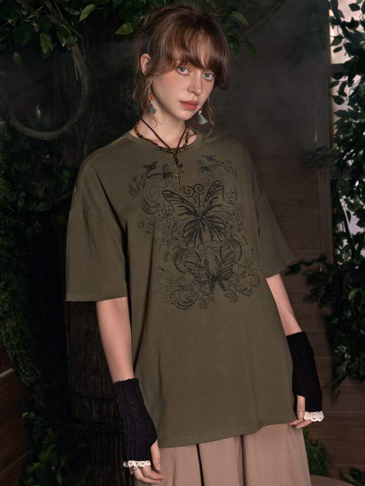 Fairycore Camiseta con caída de hombros con diamantes de imitación en forma de mariposa, para la escuela