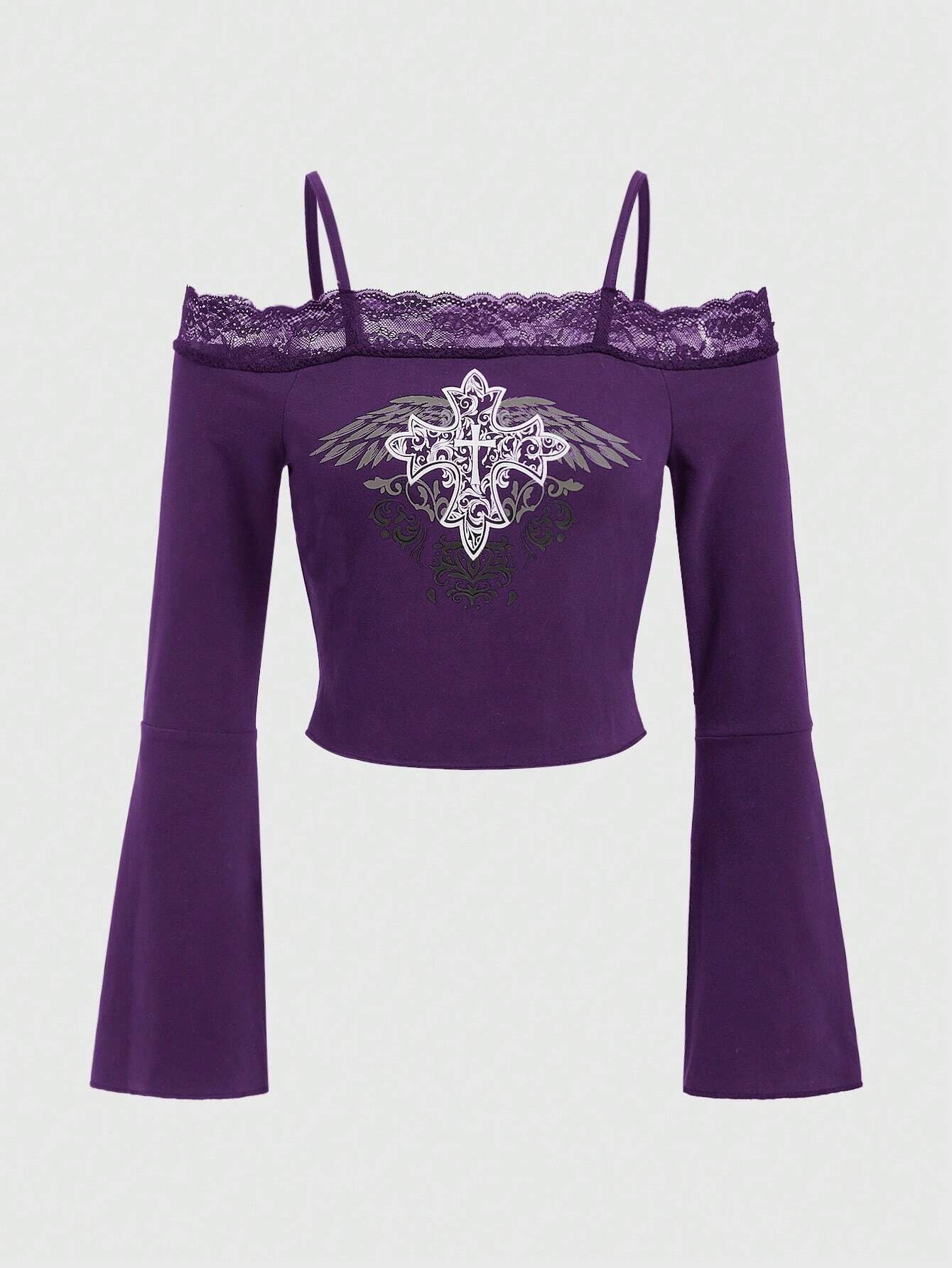 Fairycore Top tipo camiseta sin hombros con encaje y estampado de cruz en estilo vintage casual, para la temporada de otoño