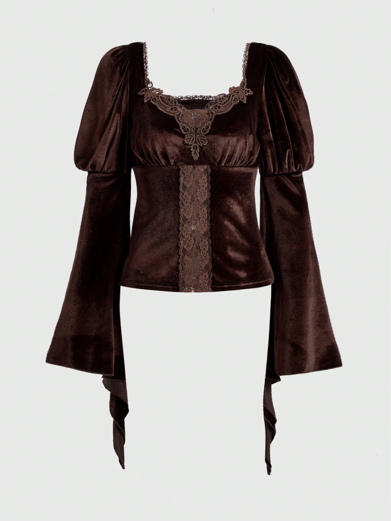 Fairycore Top con encaje en contraste de manga gigot de terciopelo