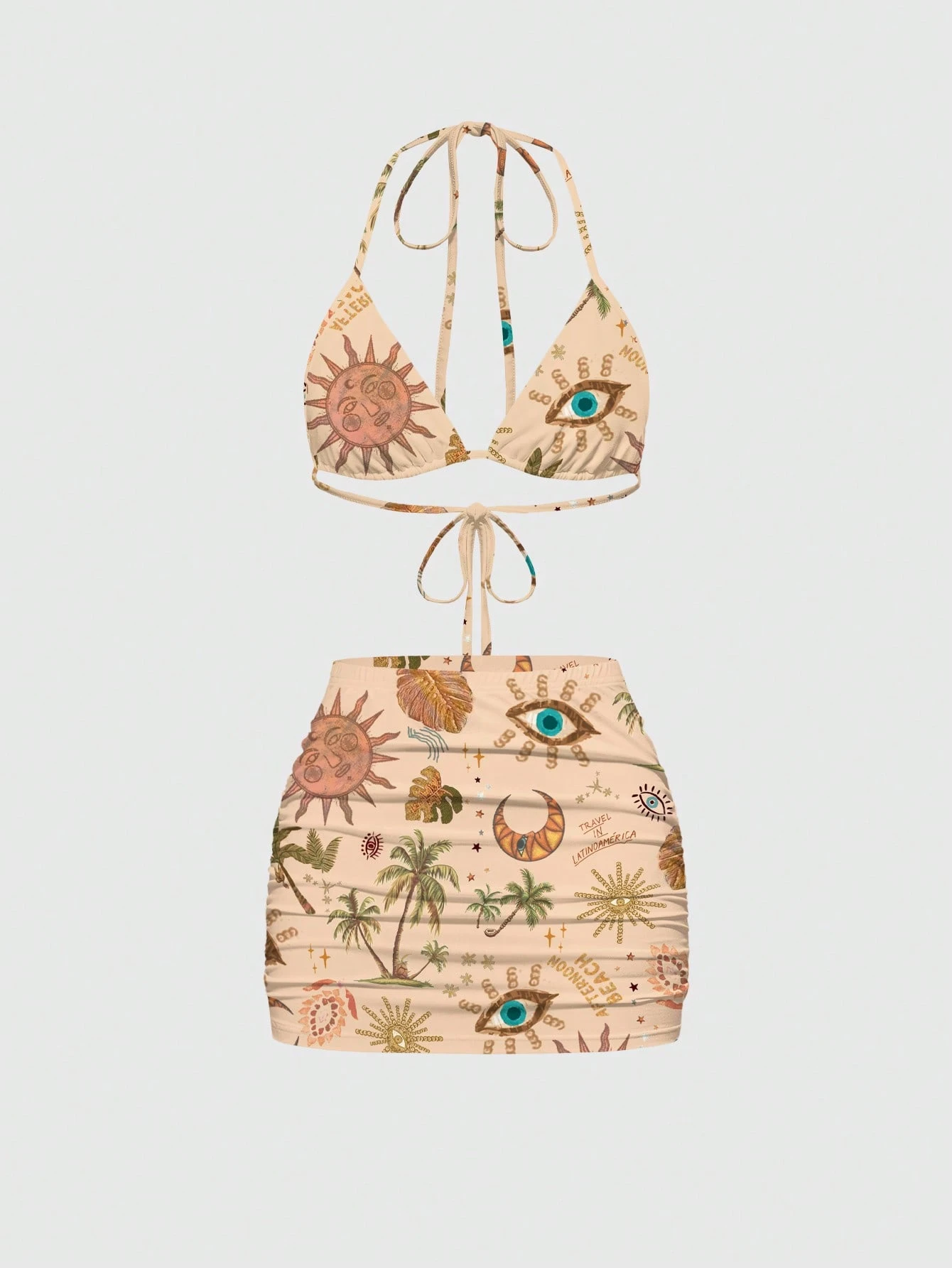 Fairycore Conjunto de 2 piezas de mujer con estampado todo sobre de ojos oscuros, sol, luna, estrella y árbol de coco, con camiseta de tirantes y minifalda ajustada para vacaciones sexy