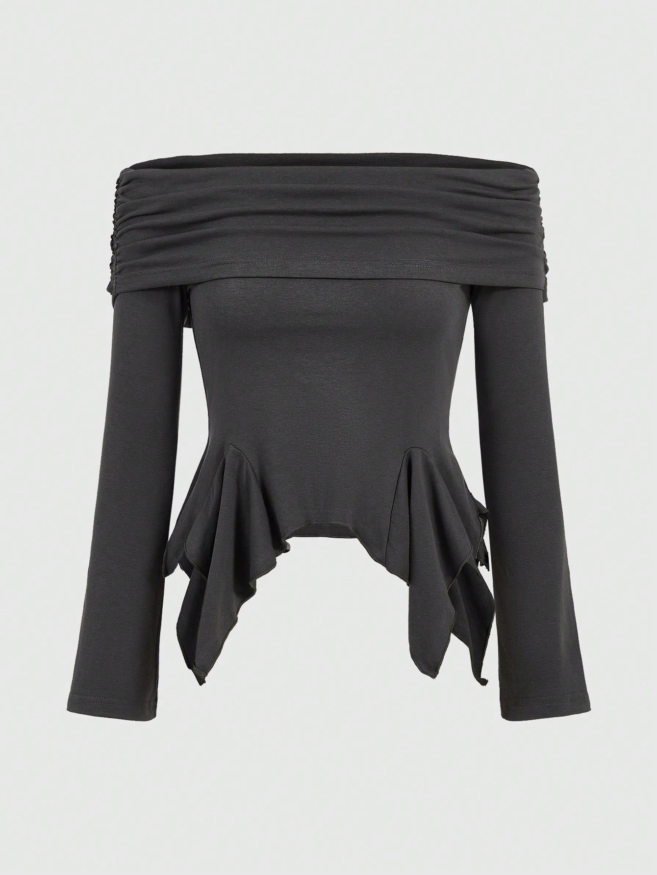 Fairycore Camiseta de manga larga con hombros descubiertos y bajo asimétrico en gris oscuro