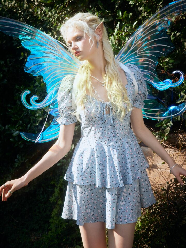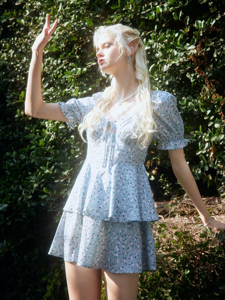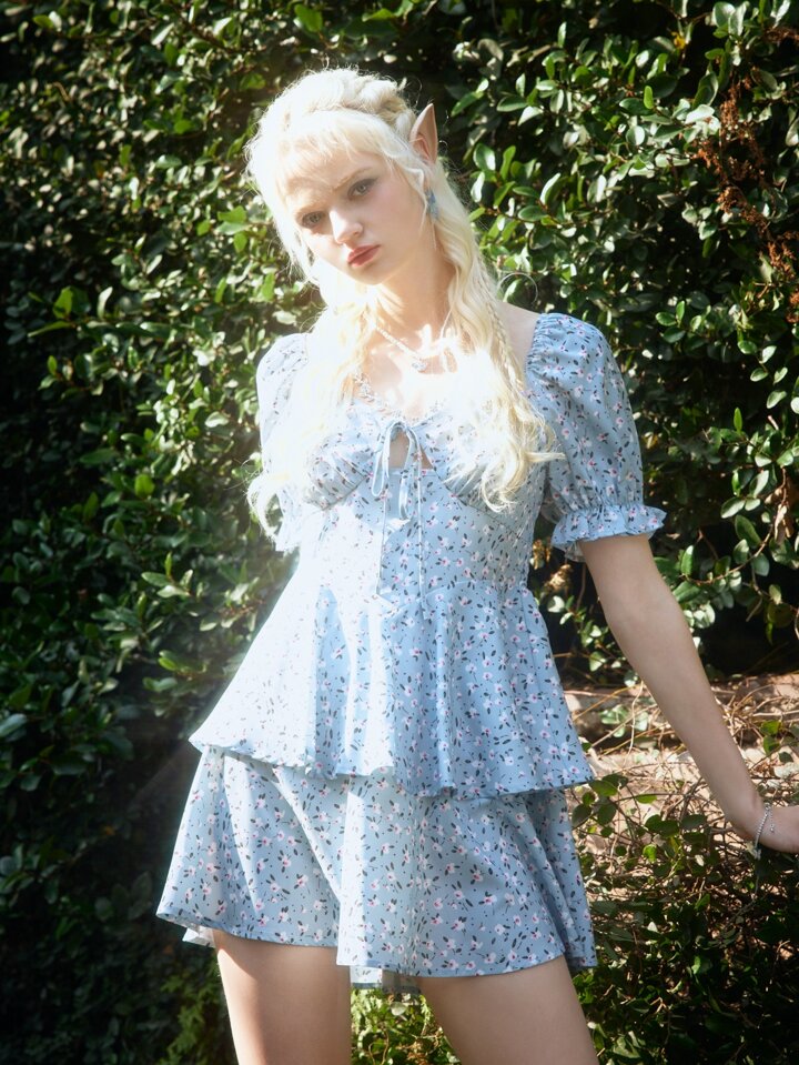 Fairycore Vestido floral con nudo bajo con fruncido
