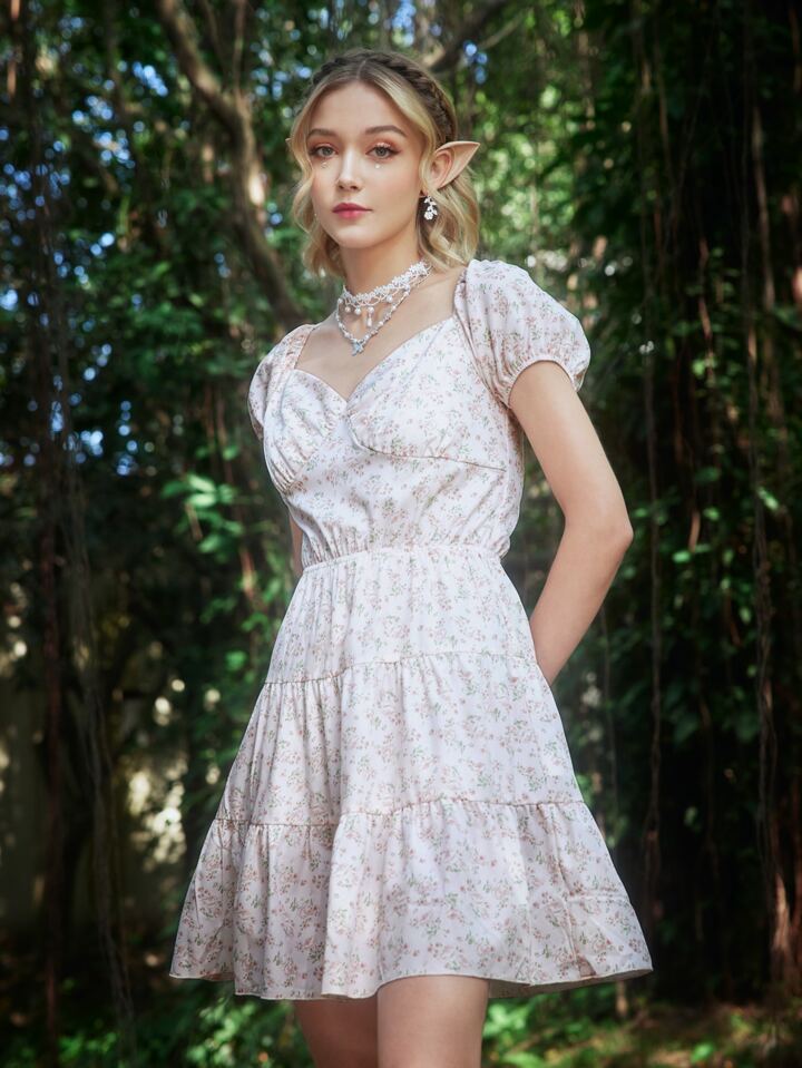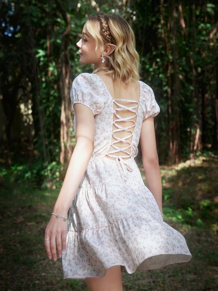 Fairycore Vestido floral de manga farol con cordón