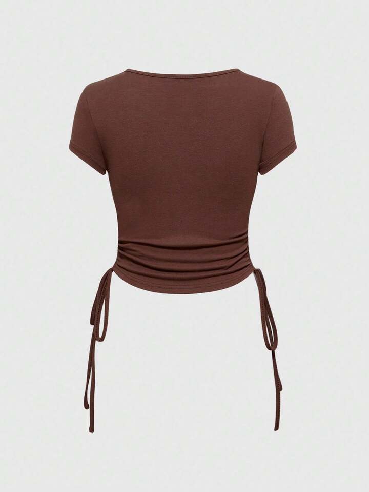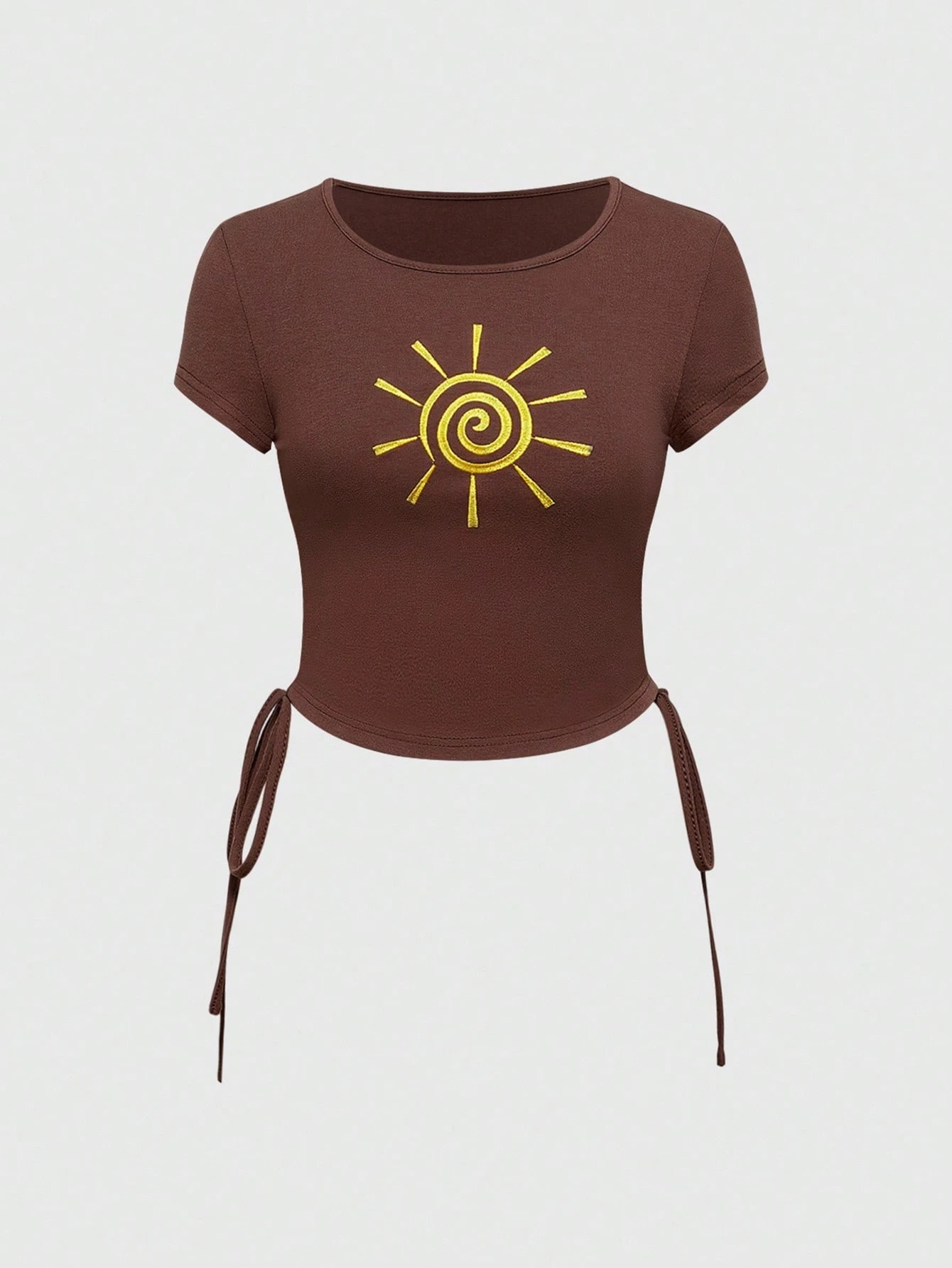 Fairycore Camiseta de punto con bordado de girasol, elástica, ajustada, acortada, con cordón y pajarita para mujer