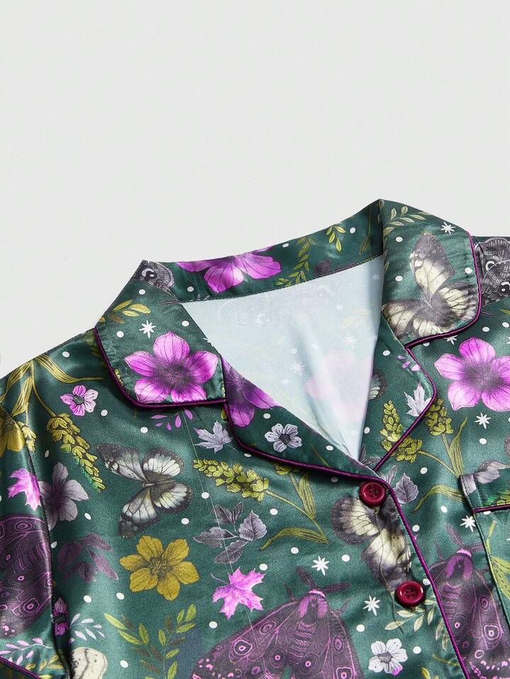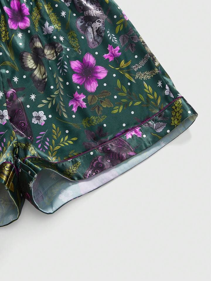 Fairycore Conjunto de pijama casual de verano de mujer con estampado floral de hadas, plantas y mariposas, con camiseta de manga corta y pantalones cortos en bloques de color
