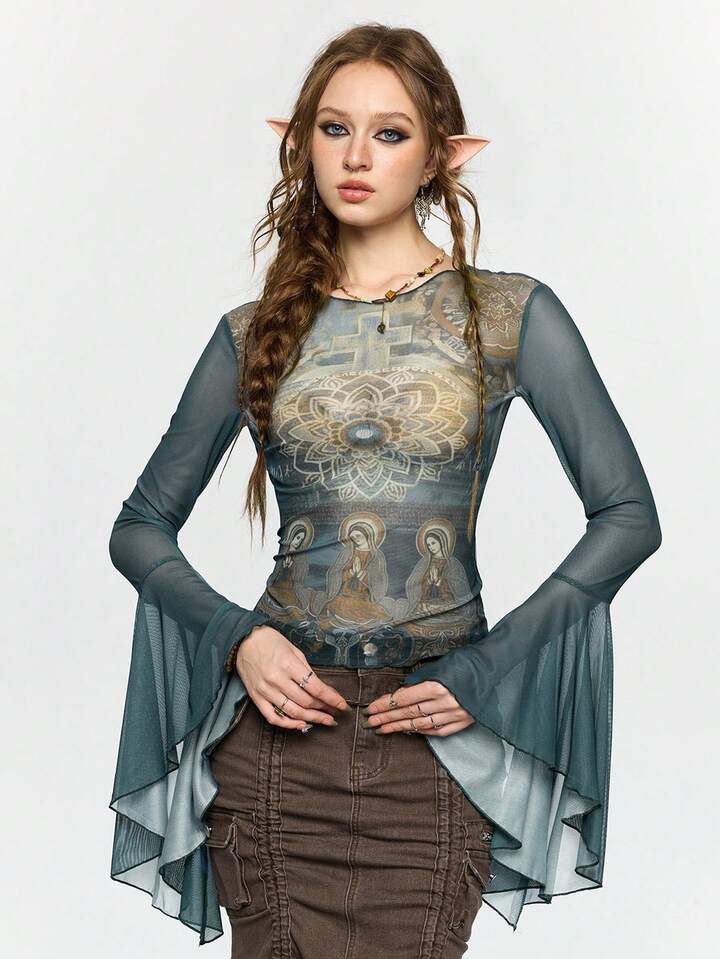 Fairycore Blusa transparente de mujer con estampado de hada, Virgen María, flor de loto y cruz, con mangas acampanadas ajustadas