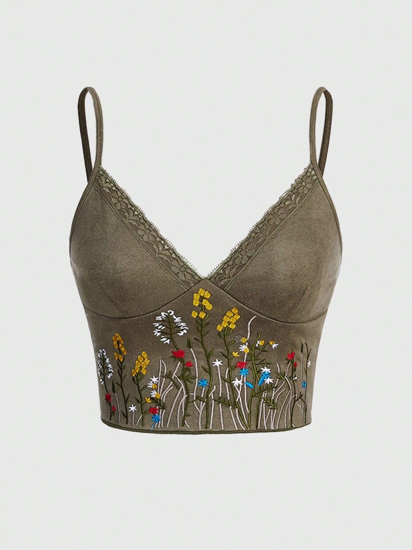 Fairycore Top de tirantes con bordado floral ribete con encaje