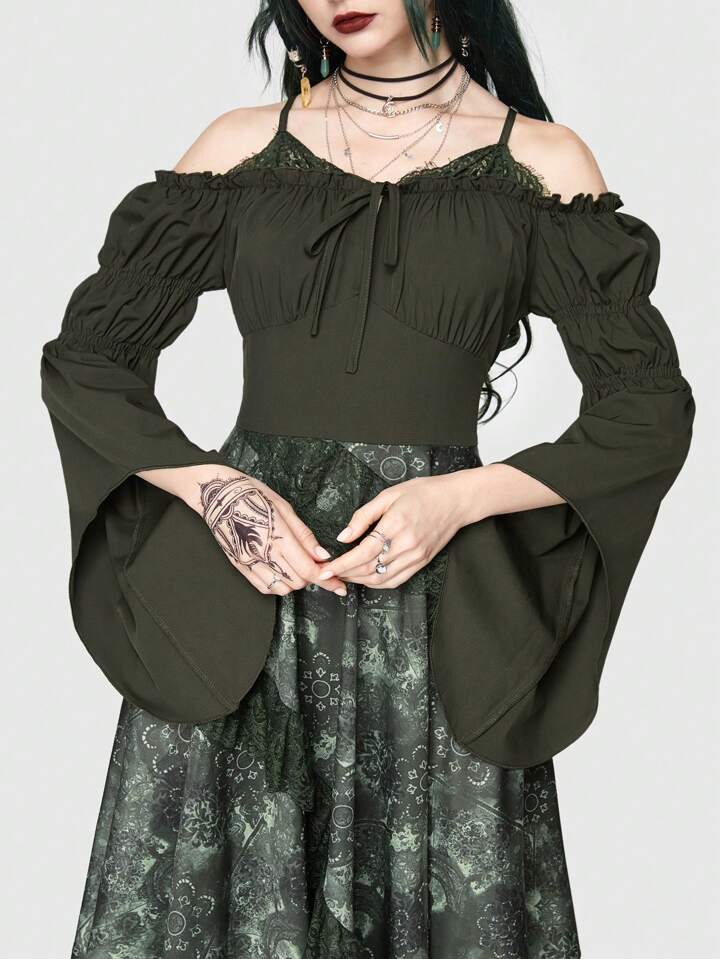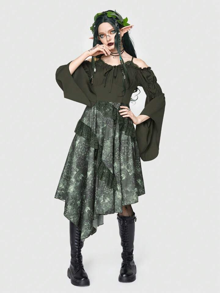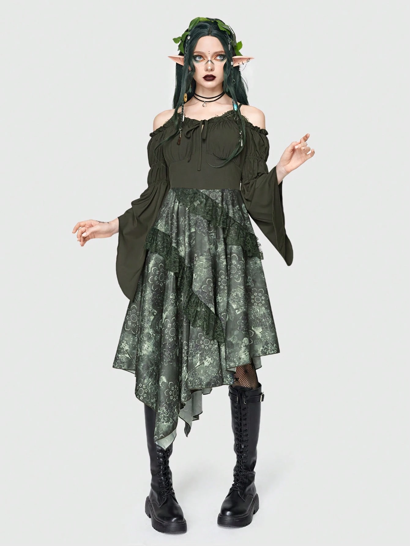 Fairycore Vestido con estampado floral de hombros descubiertos de manga amplia bajo asimétrico
