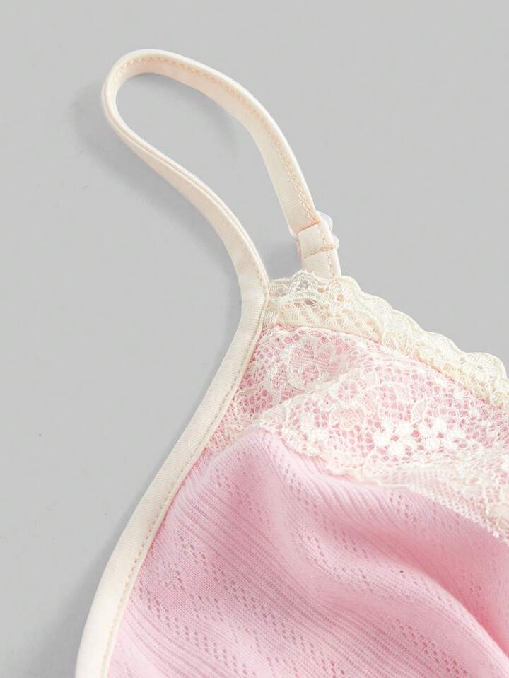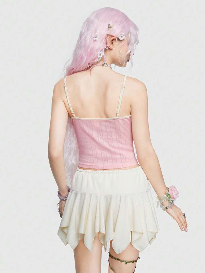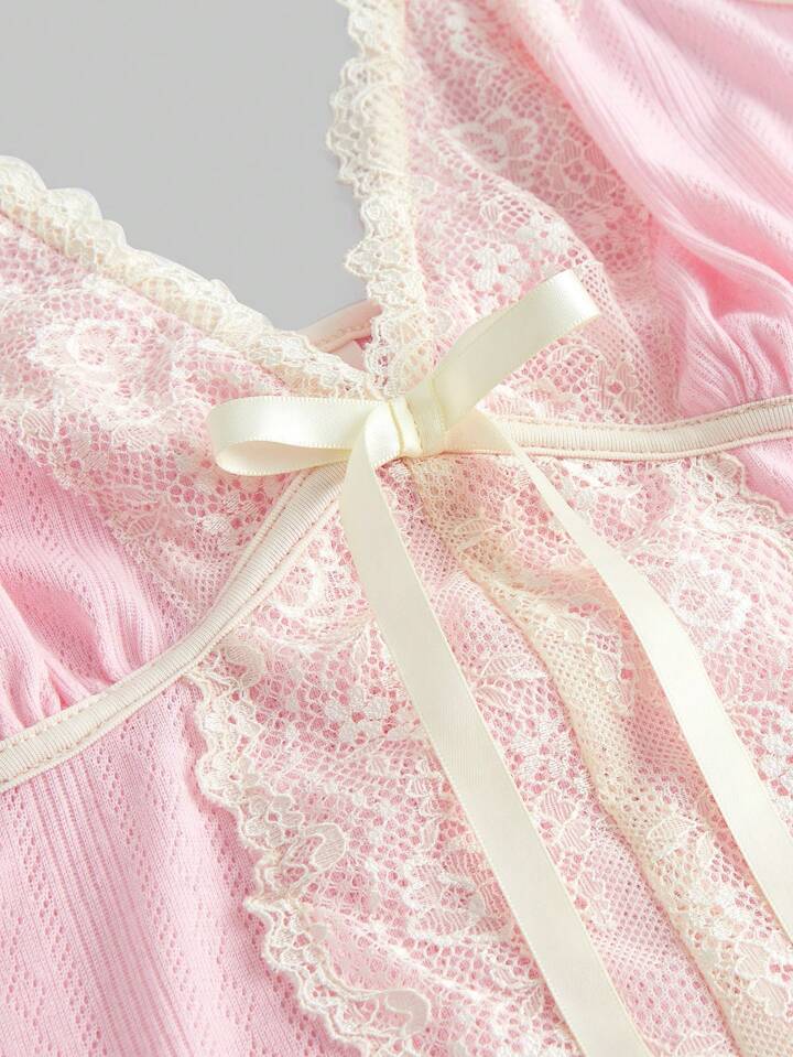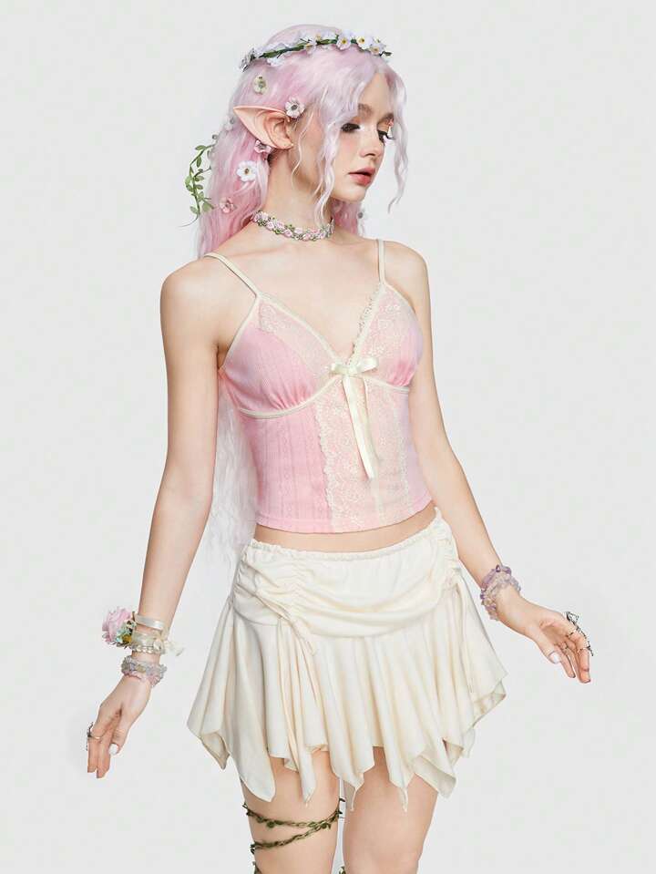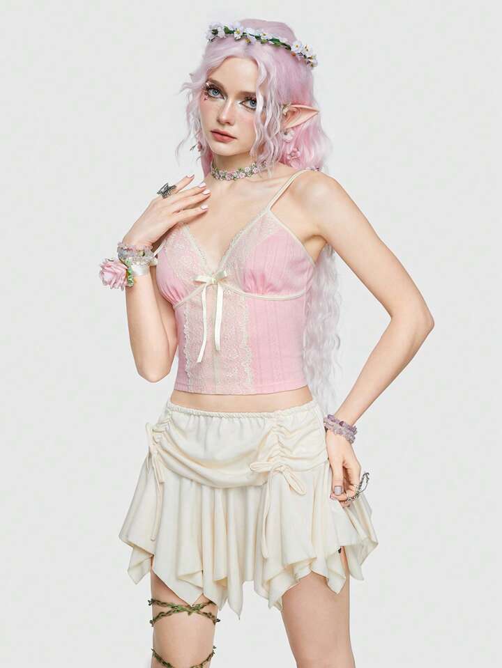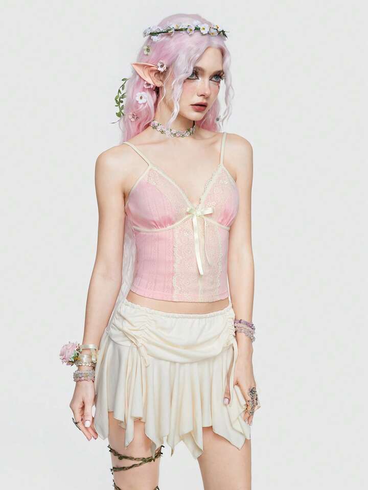 Fairycore Top Camisola Rosa Con Cuello En V Y Encaje Floral