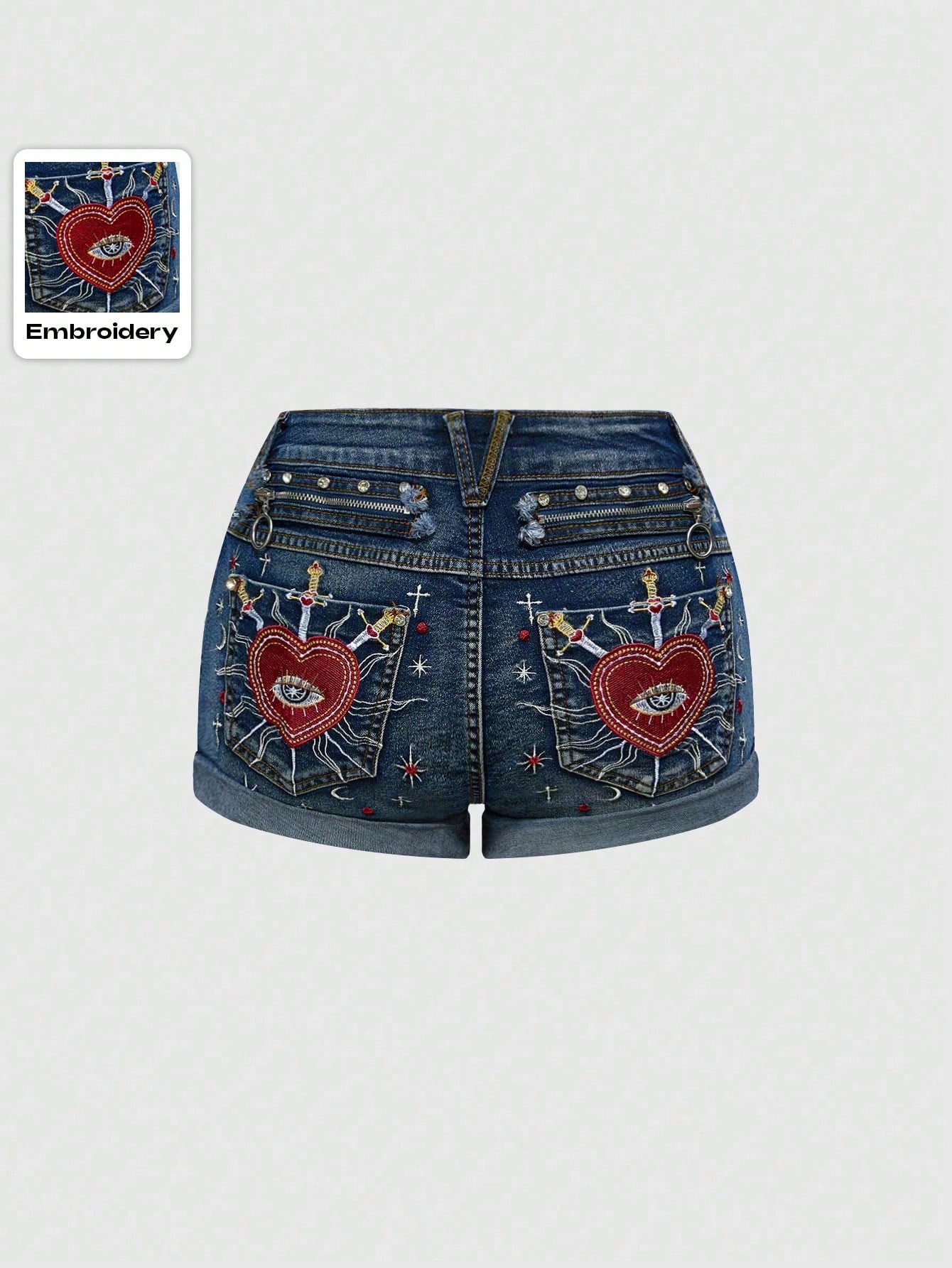 Fairycore Short de mezclilla estilo gótico victoriano de mujer con decoración bordada de corazón, lágrima de cristal, remaches y estrellas