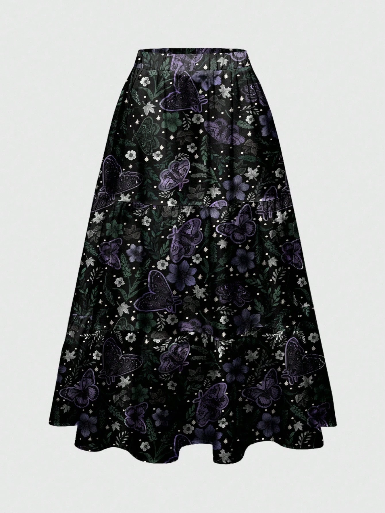 Fairycore Falda bohemia y gótica con estampado de flores elegantes, polillas, murciélagos, soles, lunas, estrellas y mariposas en azul, verde y morado para mujeres