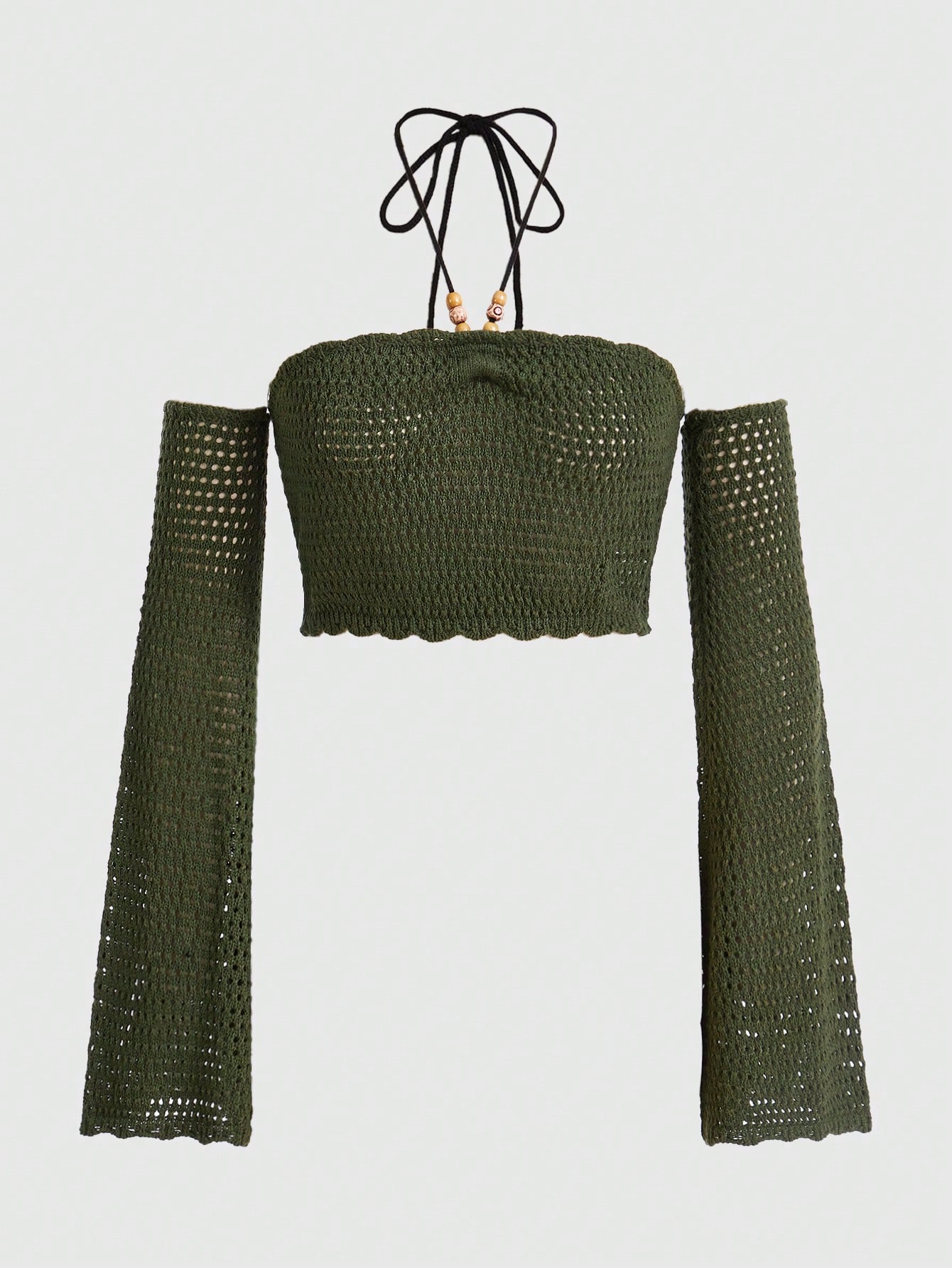 Fairycore Jersey crop con abertura de cuello halter manga de campana