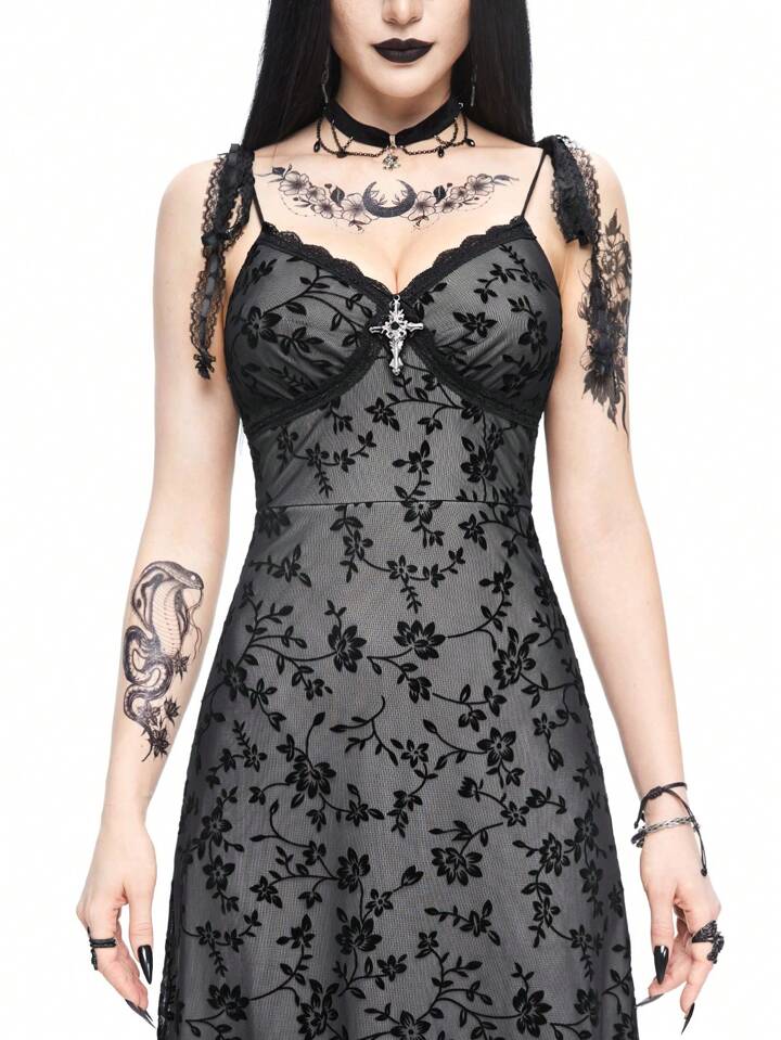 Fairycore Vestido largo de cami de punto con ribete de encaje y patrón de cruz con terciopelo en relieve para mujer