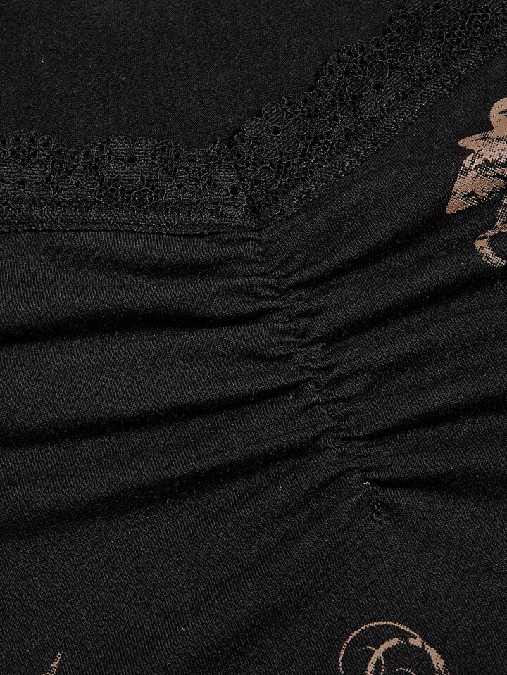 Fairycore Camiseta Negra De Manga Corta Con Cuello En V Con Encaje Y Estampado Floral Para Mujer