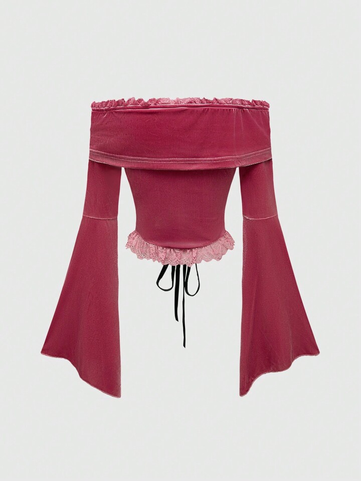 Fairycore Blusa con hombros descubiertos, de estilo vintage palaciego, con encaje, manga acampanada y cordones