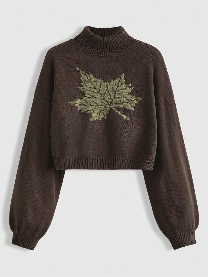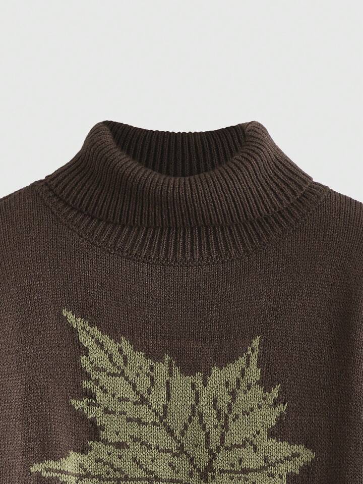 Fairycore Suéter De Cuello Alto Con Patrón De Hojas Y Hombros Caídos