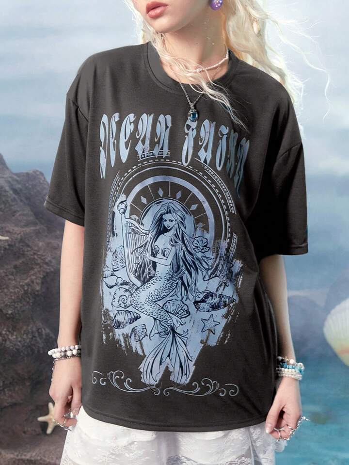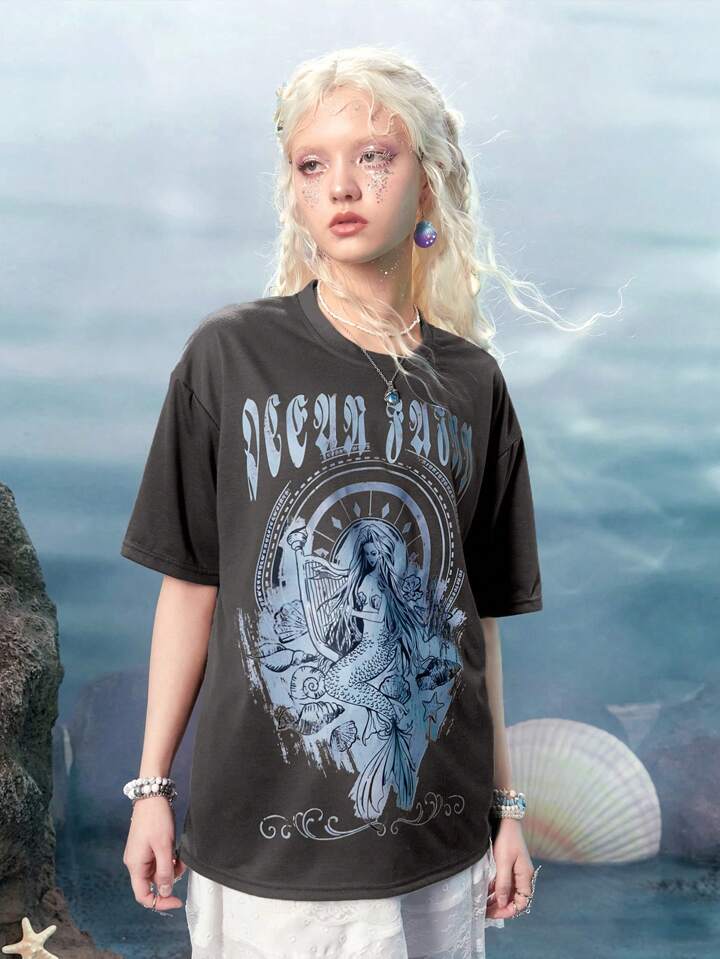 Fairycore Sirena Camiseta de hombros caídos con estampado de letra