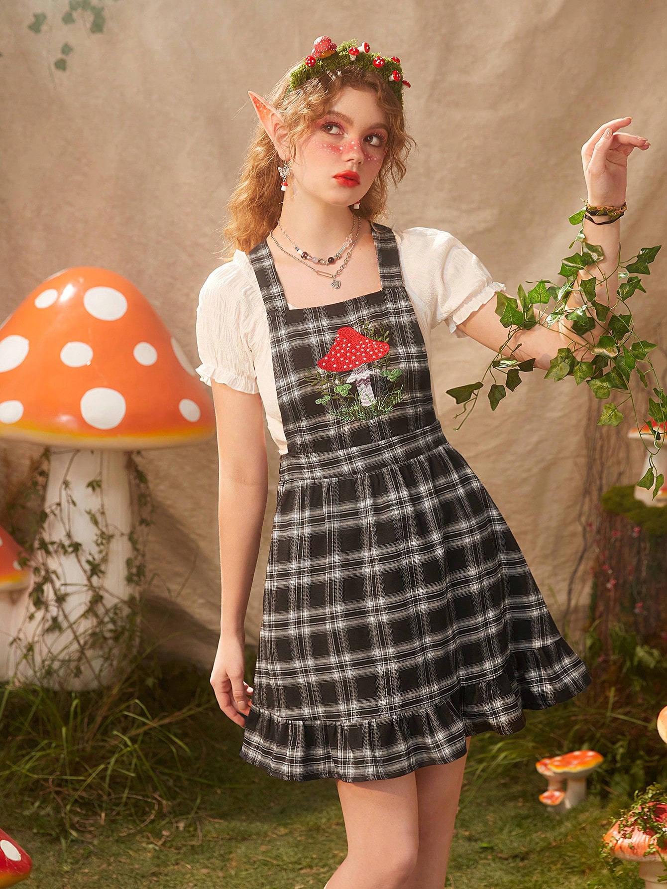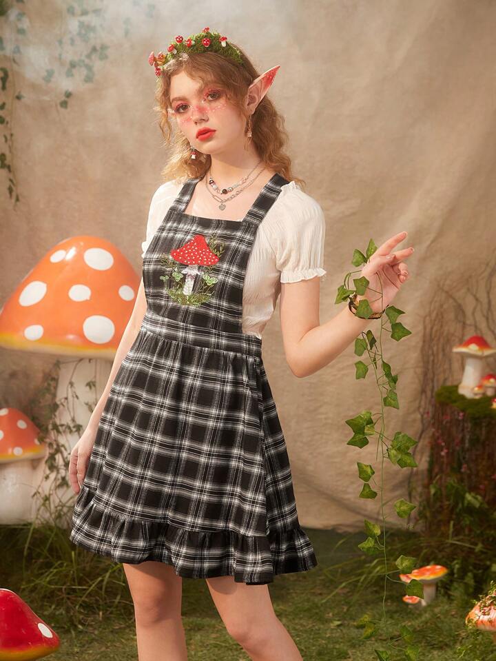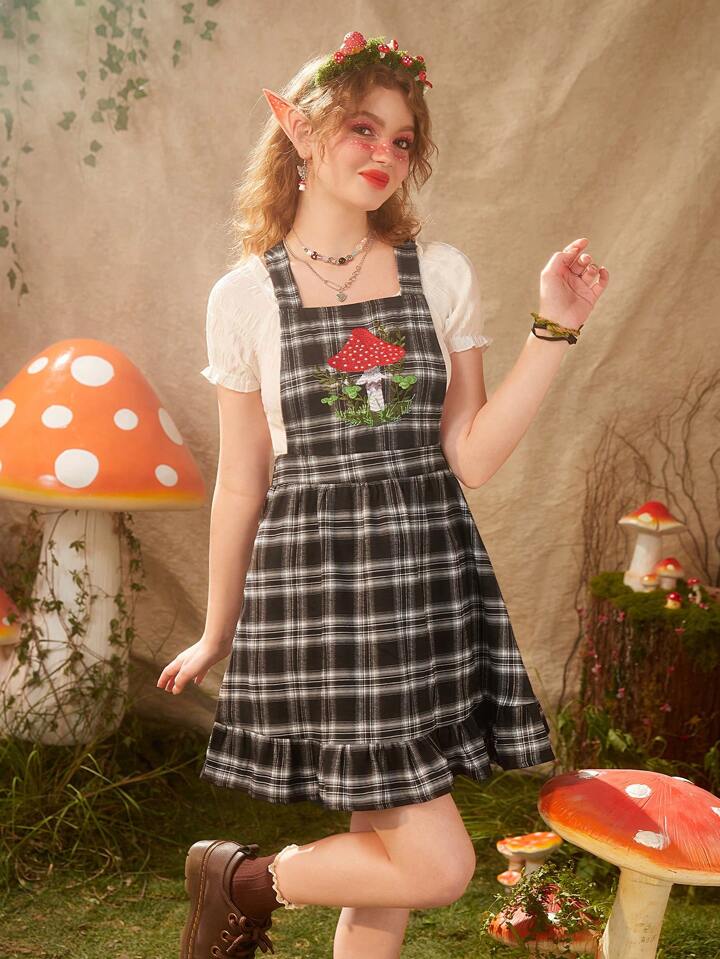 Fairycore Vestido Bordado Bajo con volante A cuadros Plantas Casual