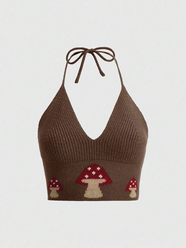 Fairycore Top de punto con patrón de seta de espalda abierta con cordón halter
