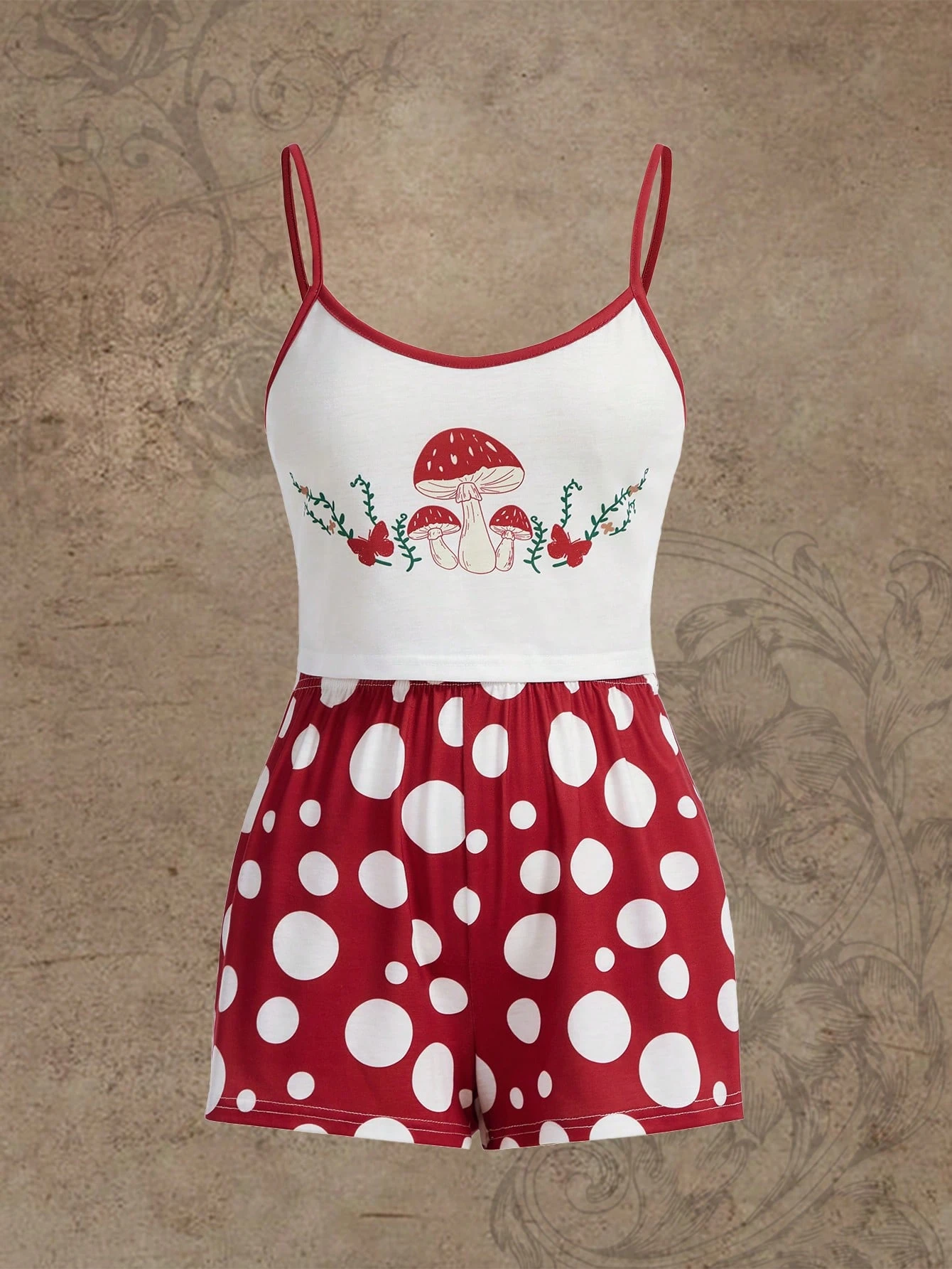 Fairycore con estampado de seta unido en contraste Cami & de lunares Shorts Conjunto de pijama