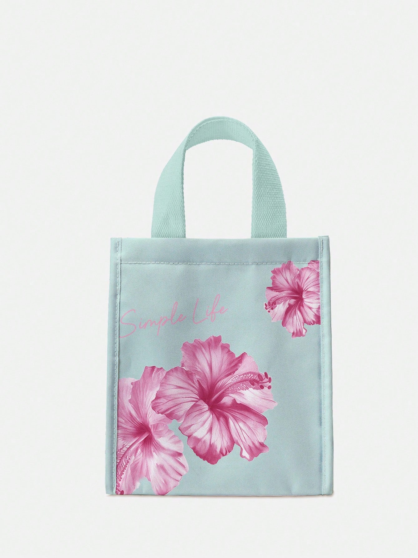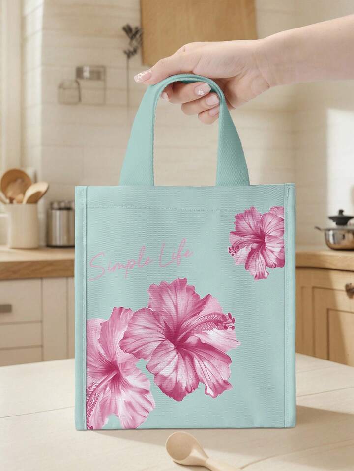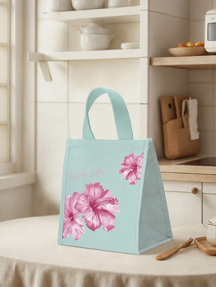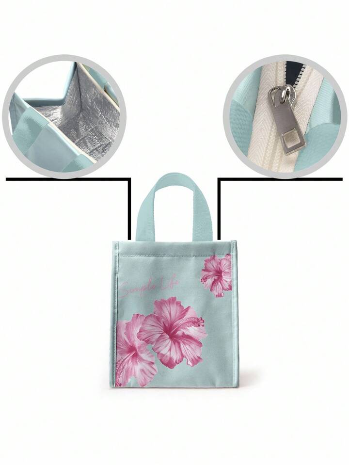 Fairycore Bolsa de almuerzo aislada de color verde menta con estampado floral rosa, bolsa funcional, bolsa de almuerzo, bolsa refrigeradora