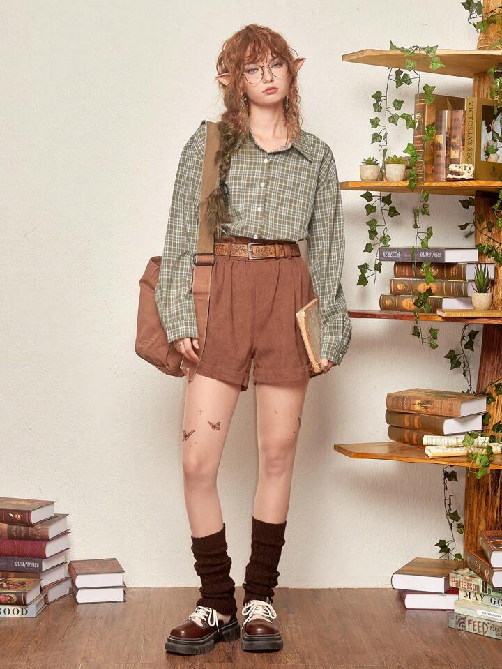 Fairycore Camisa con estampado de cuadros de hombros caídos