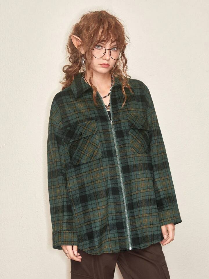 Fairycore Abrigo con estampado de cuadros de hombros caídos con cremallera con bolsillo con solapa