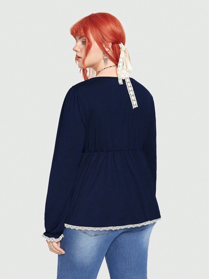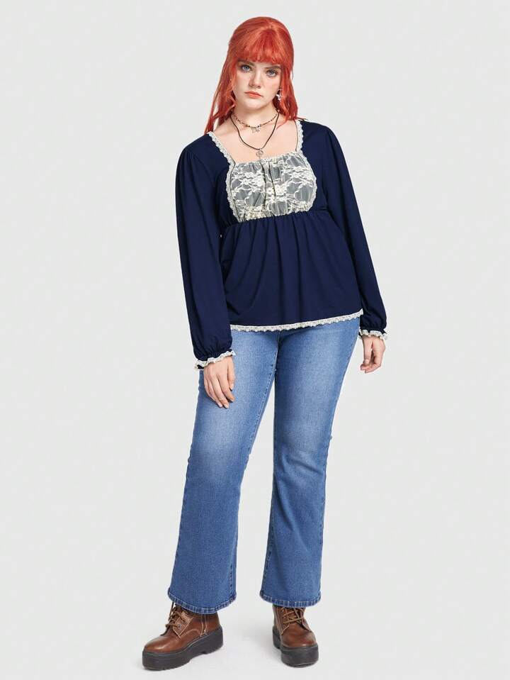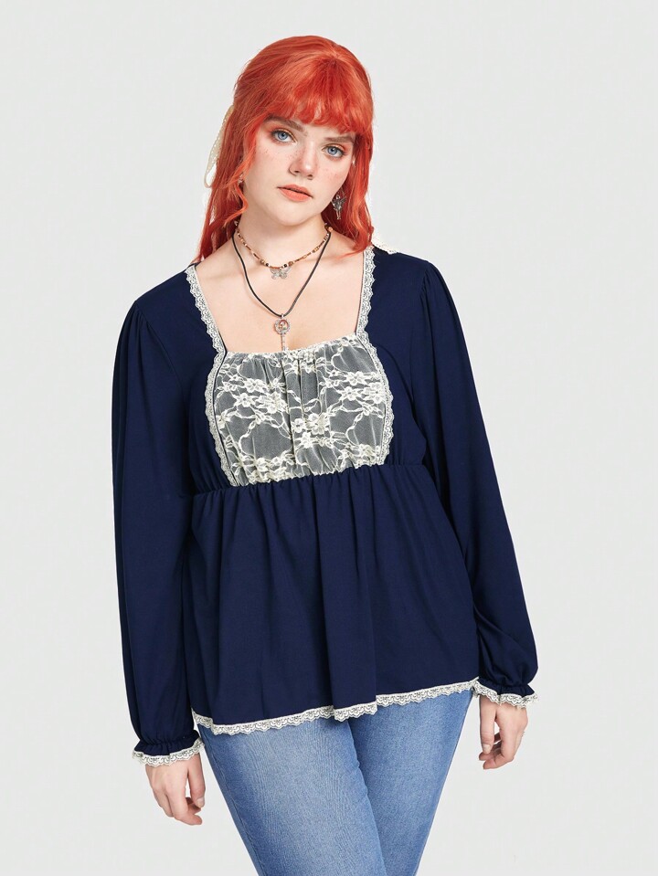 Fairycore Talla grande Camiseta con encaje en contraste de cuello cuadrado peplum