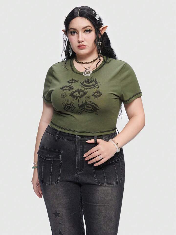 Fairycore Talla grande Camiseta crop con estampado de ojo ribete con puntada
