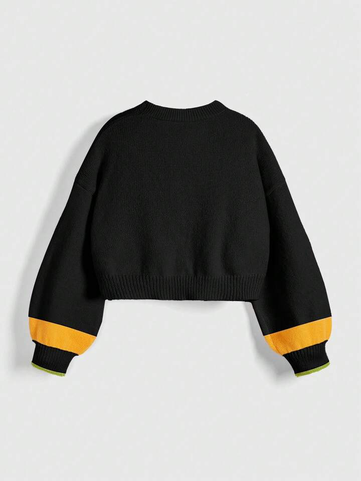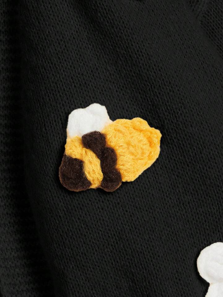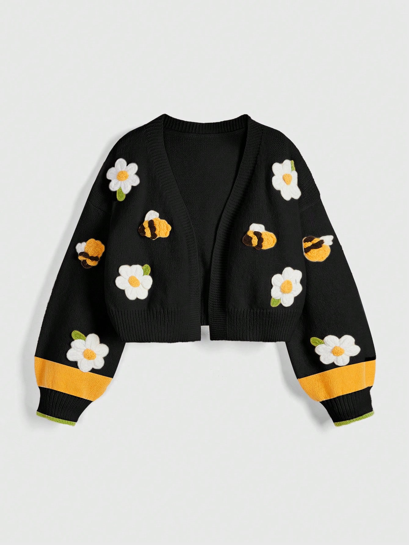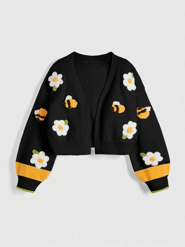 Fairycore Cárdigan de manga farol con bordado de flores y abejas en bloques de color talla grande, Cárdigan de punto negro talla grande, Cárdigan de punto lindo y dulce para niña en Navidad
