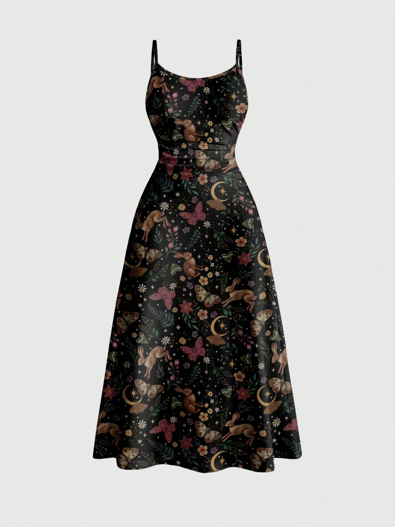 Fairycore Vestido de tirantes sexy con estampado de conejo, plantas, sol, luna y estrellas, estilo hippie, talla grande, adecuado para vacaciones de primavera/verano