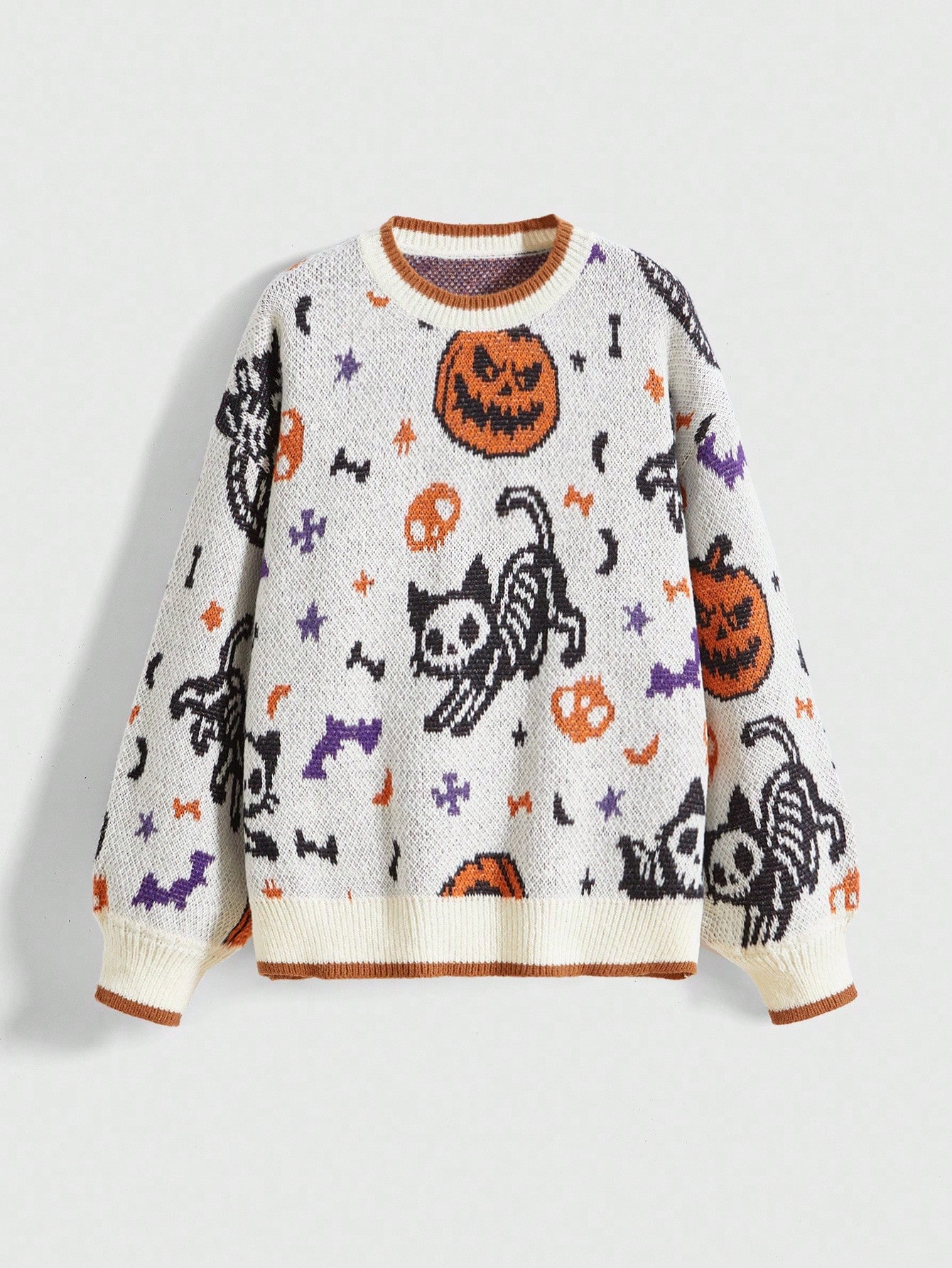 Fairycore Suéter holgado de cuello redondo con estampado jacquard de calabaza, calavera y gato para mujer de talla grande