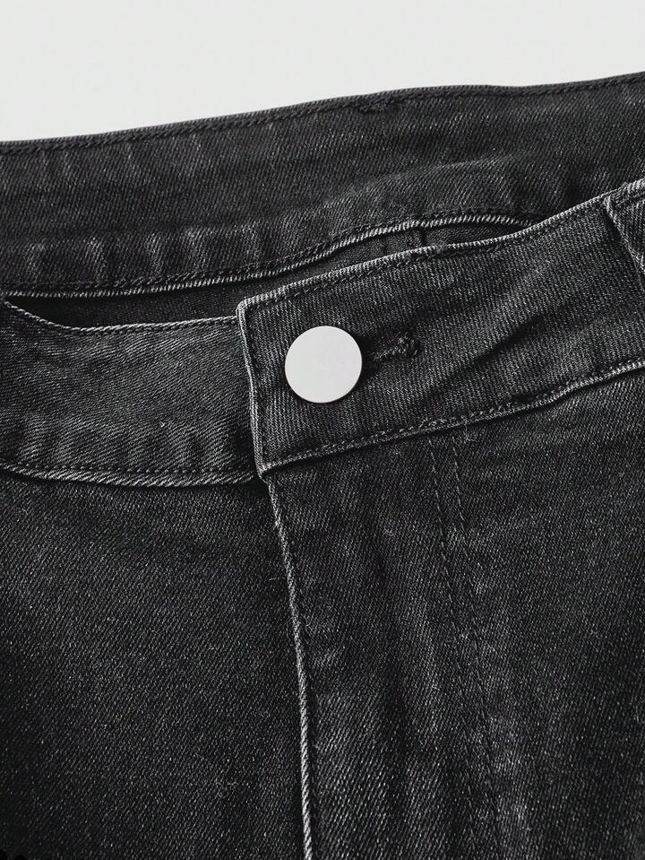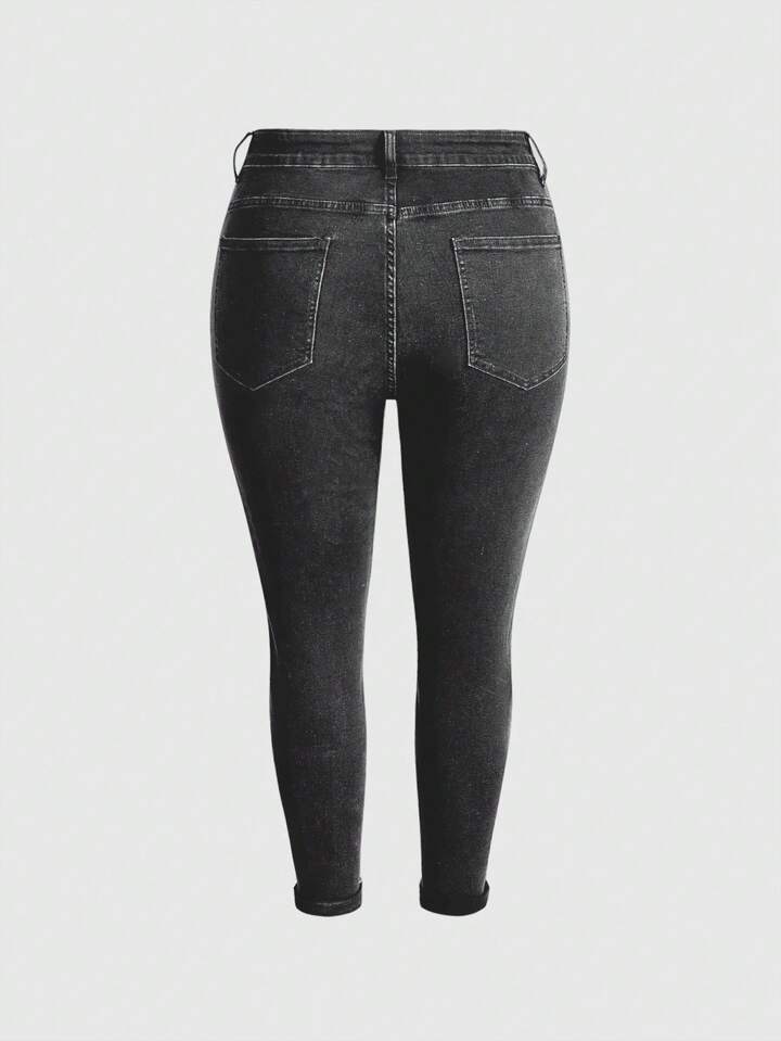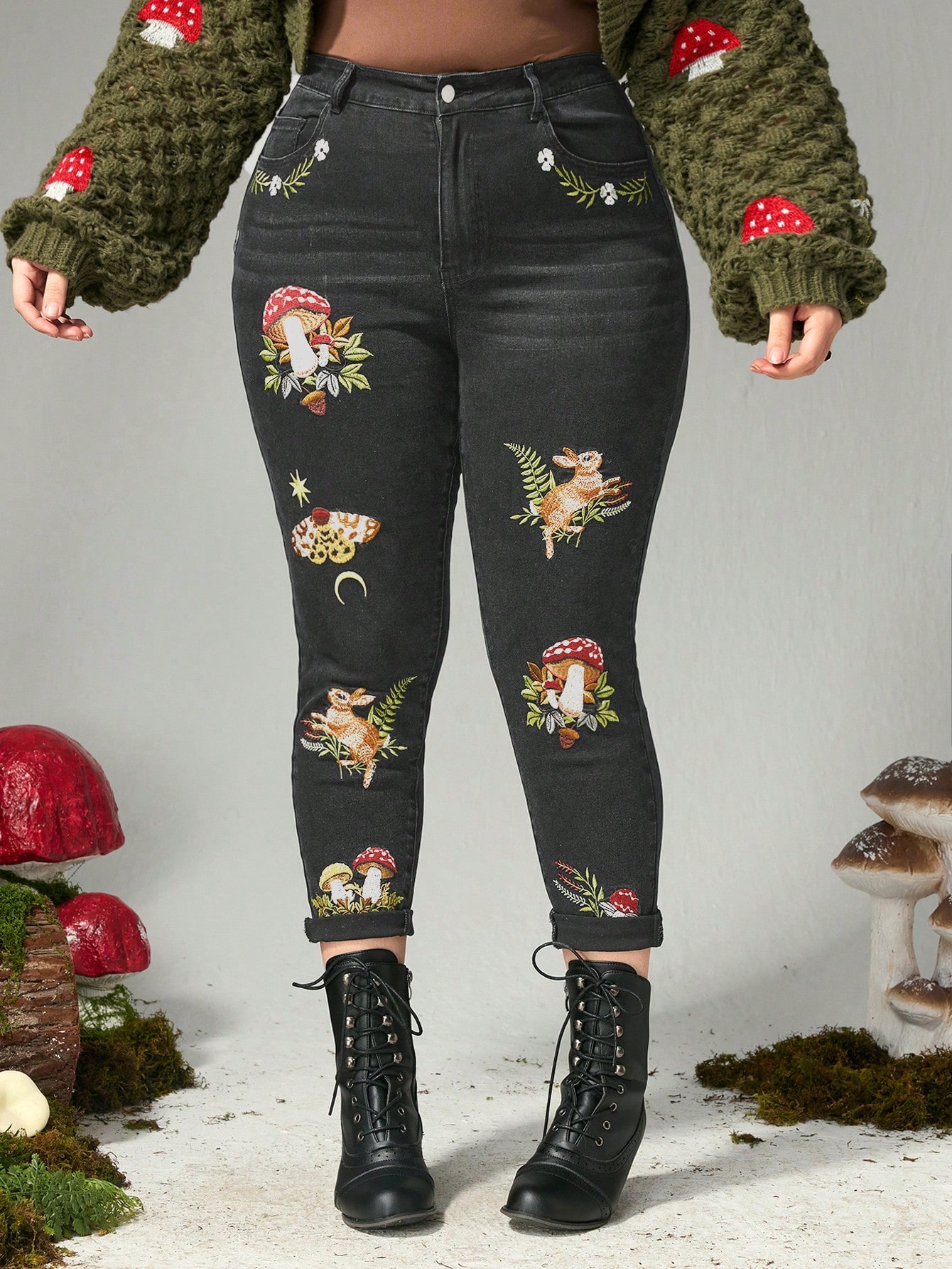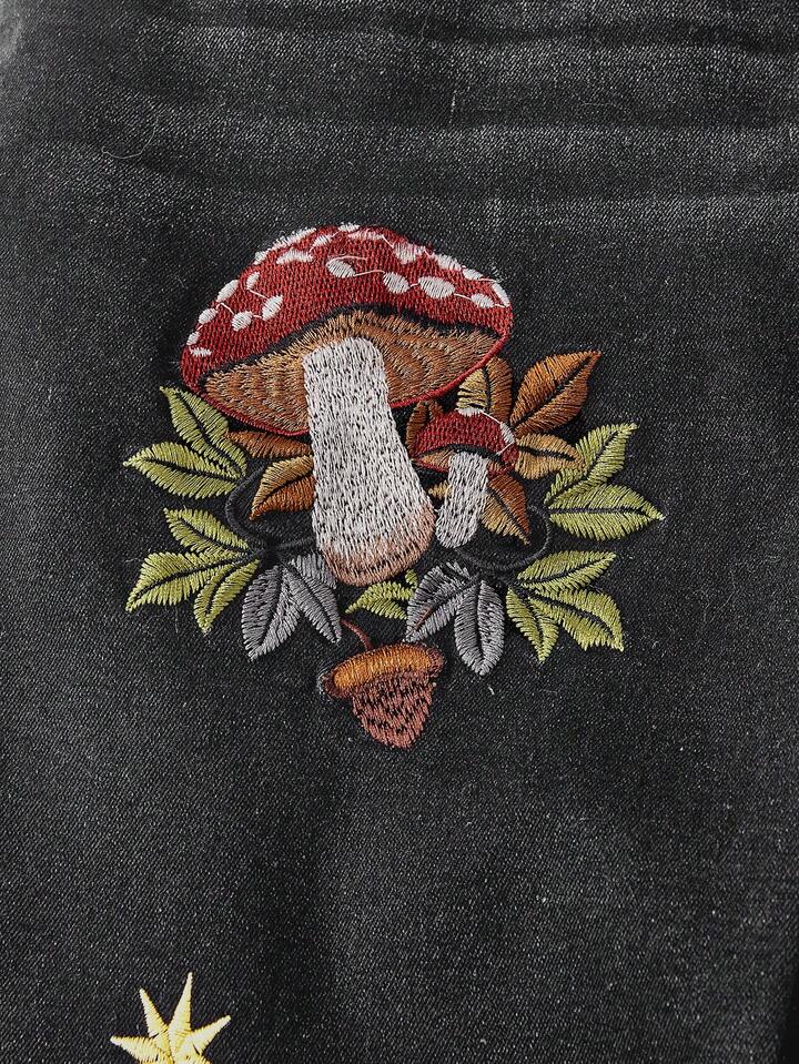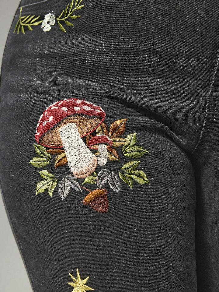 Fairycore Jeans de talla grande para mujer con bordado de plantas de setas oscuras y puños de 7/8 de longitud