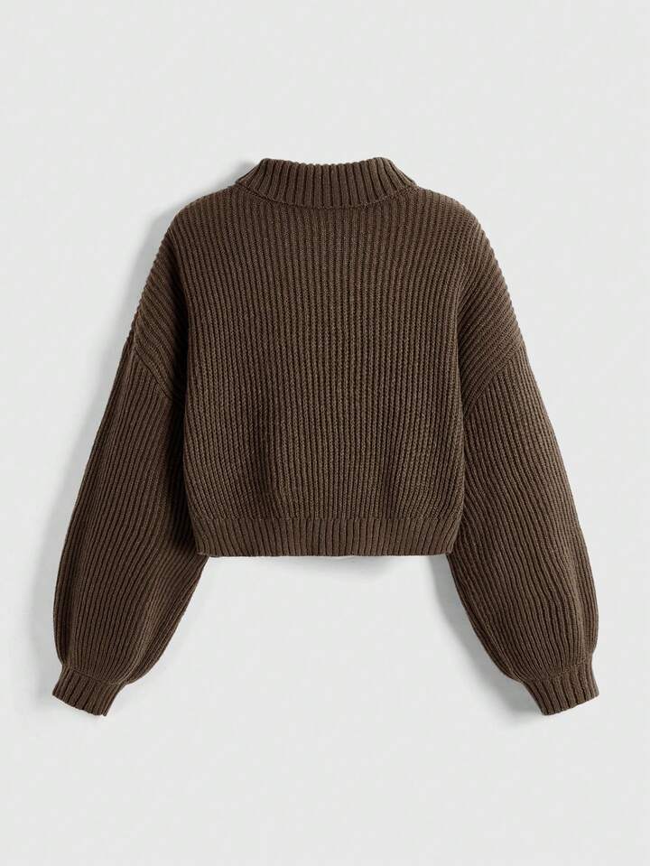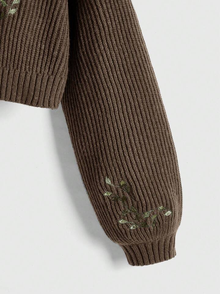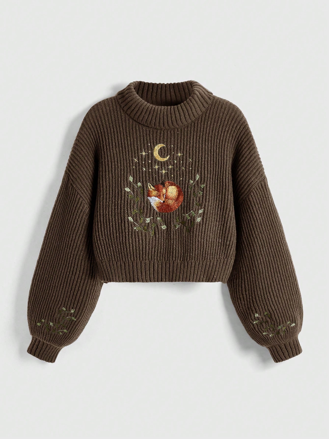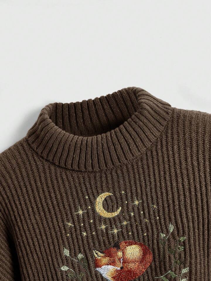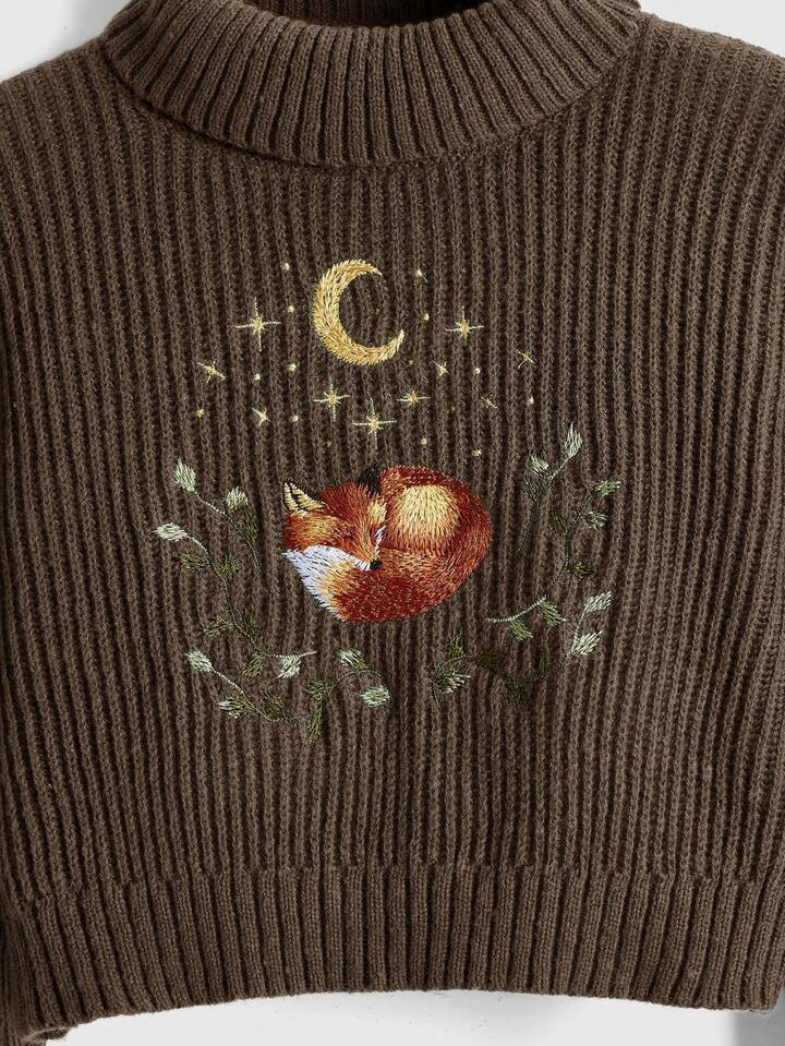 Fairycore Suéter casual de manga larga con cuello alto, hombros caídos, bordado de zorro y flores para mujer de talla grande