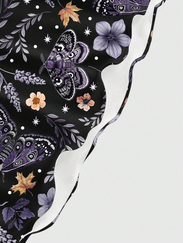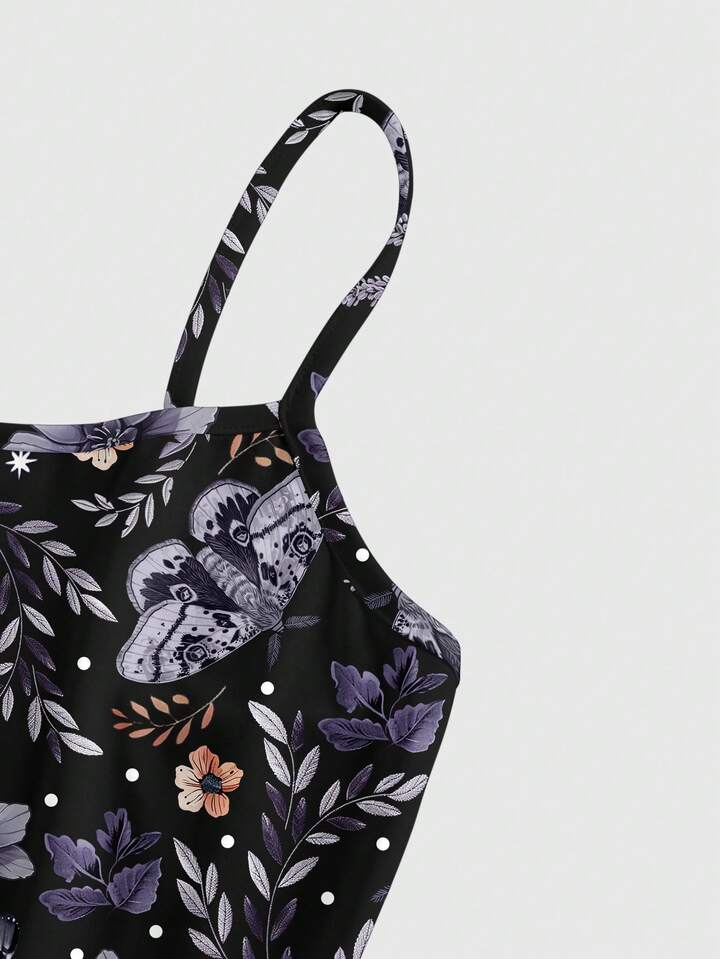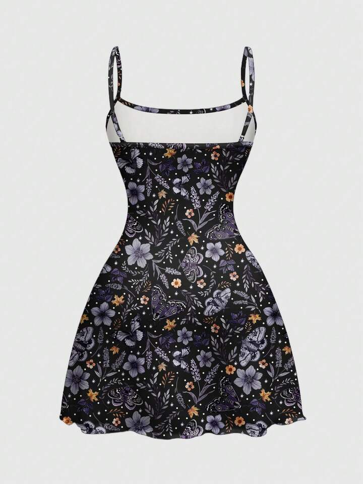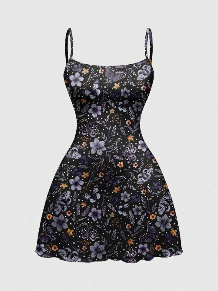 Fairycore Vestido de tirantes de mujer talla grande con estampado todo sobre de flores, plantas, mariposas, sol, luna y hojas para vacaciones de verano, elástico y sexy