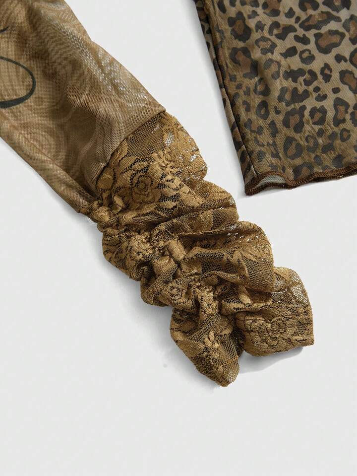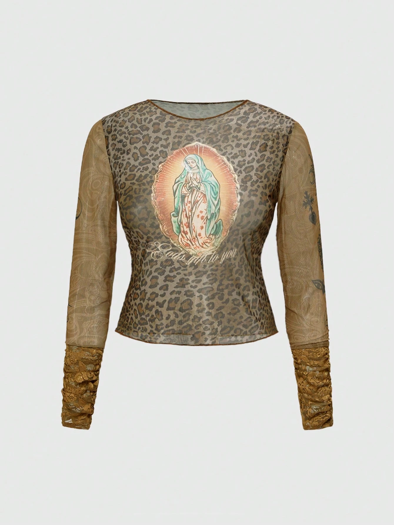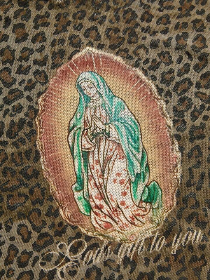 Fairycore Blusa ajustada y transparente con estampado de leopardo y motivo religioso de la Virgen María, talla grande, estilo Y2K vintage para mujer