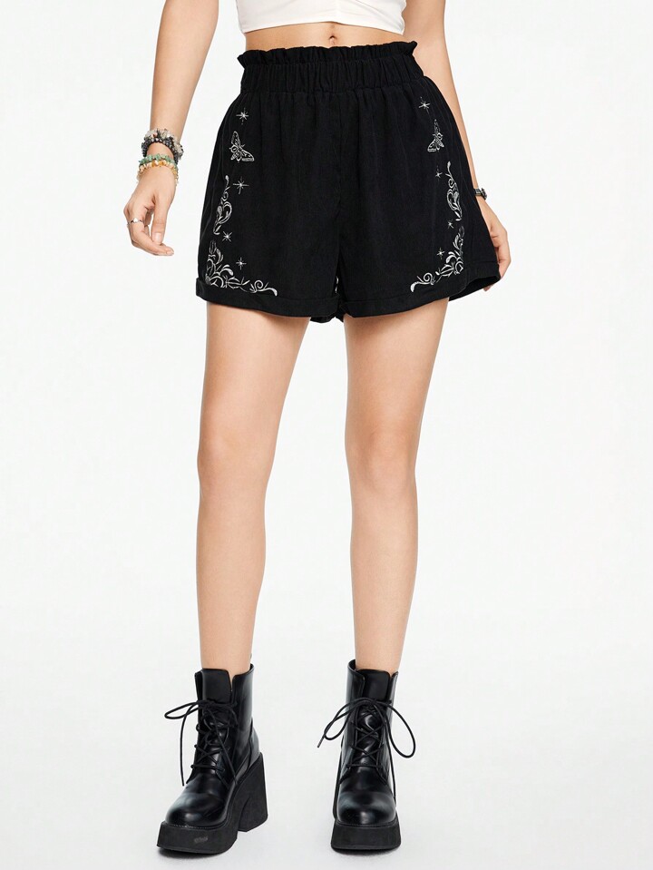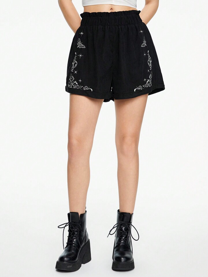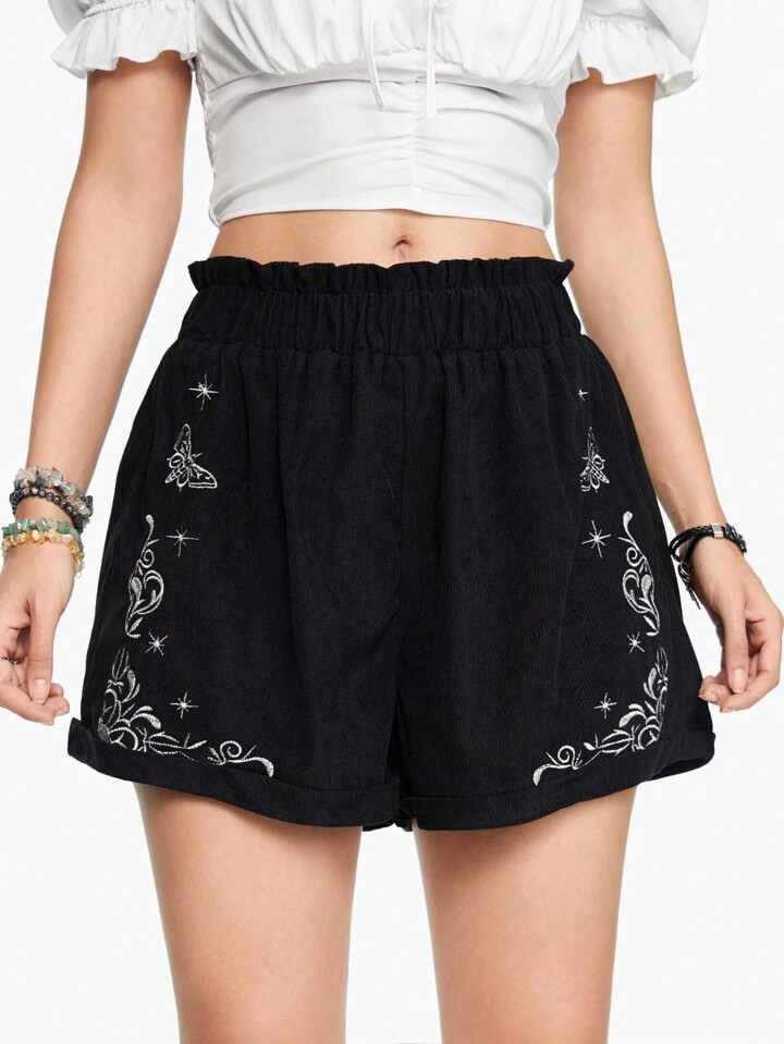 Fairycore Pantalones cortos de mujer de pana con bordado de enredadera retro