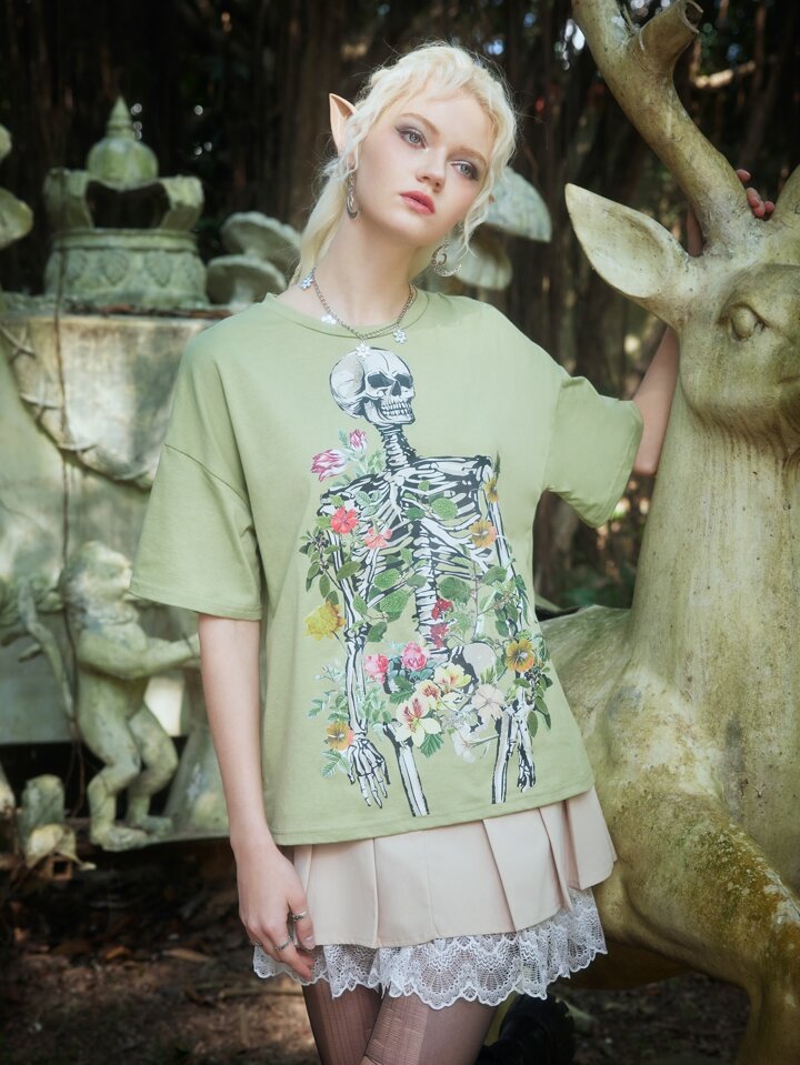 Fairycore Camiseta de hombros caídos esqueleto & con estampado floral