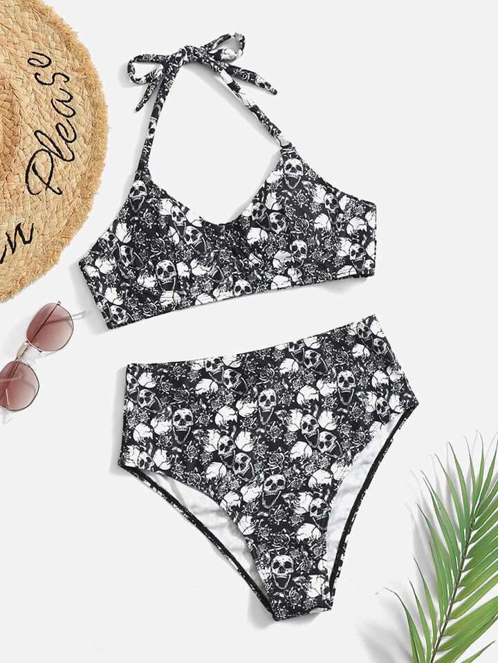Fairycore Bikini de cuello halter con gráfico de calavera y flores