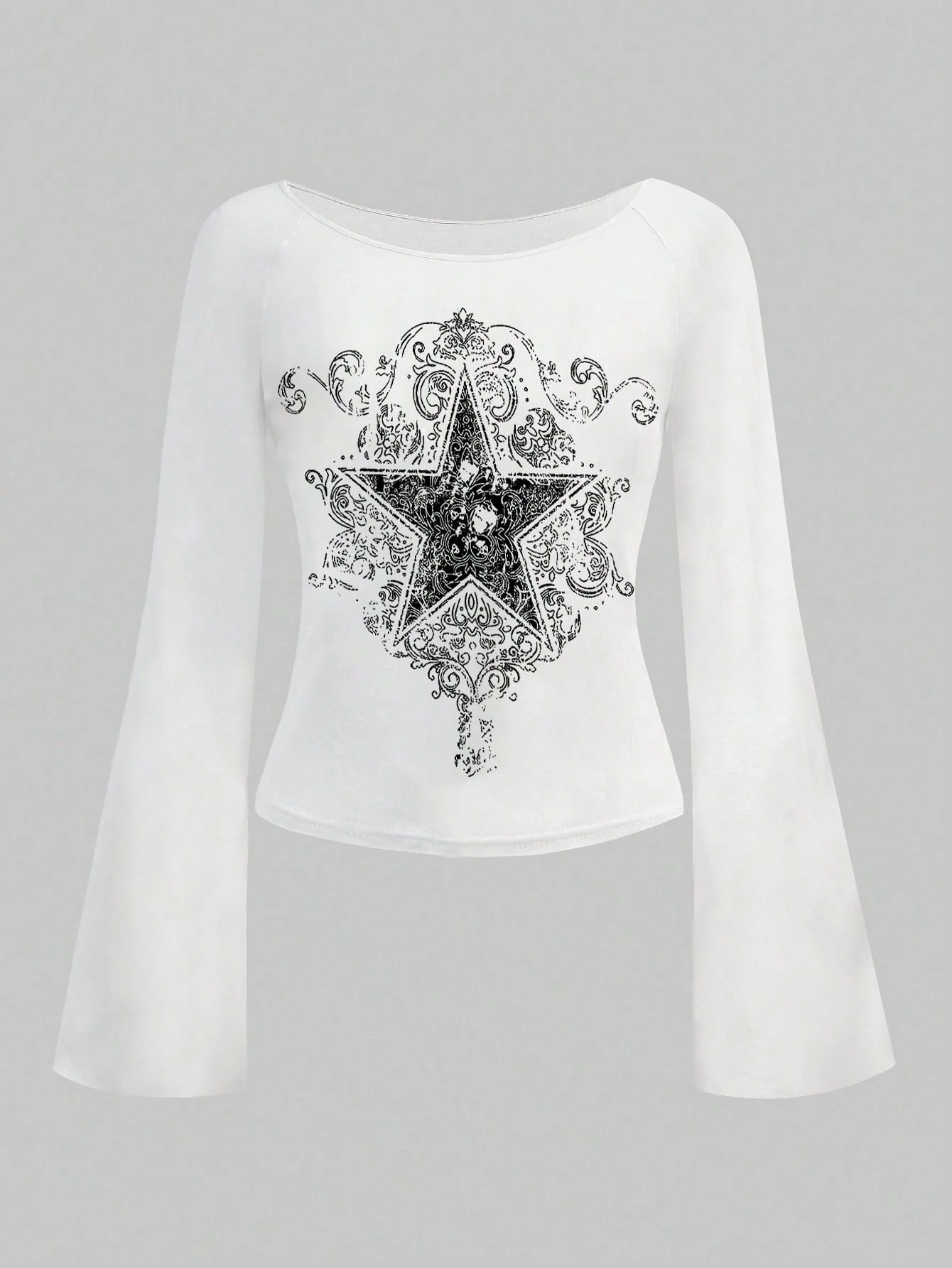Fairycore Camiseta Con Estampado De Estrella Y Mangas Acampanadas