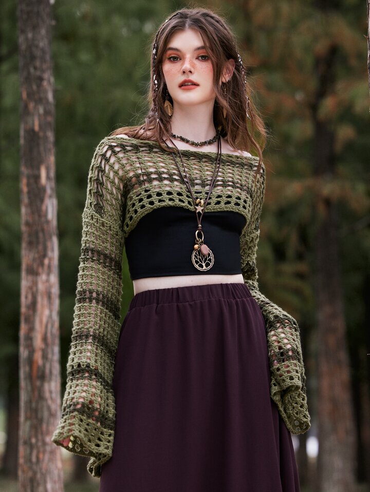 Fairycore Suéter corto de verano tejido a crochet con estampado de rayas y calado, top de manga larga para la escuela