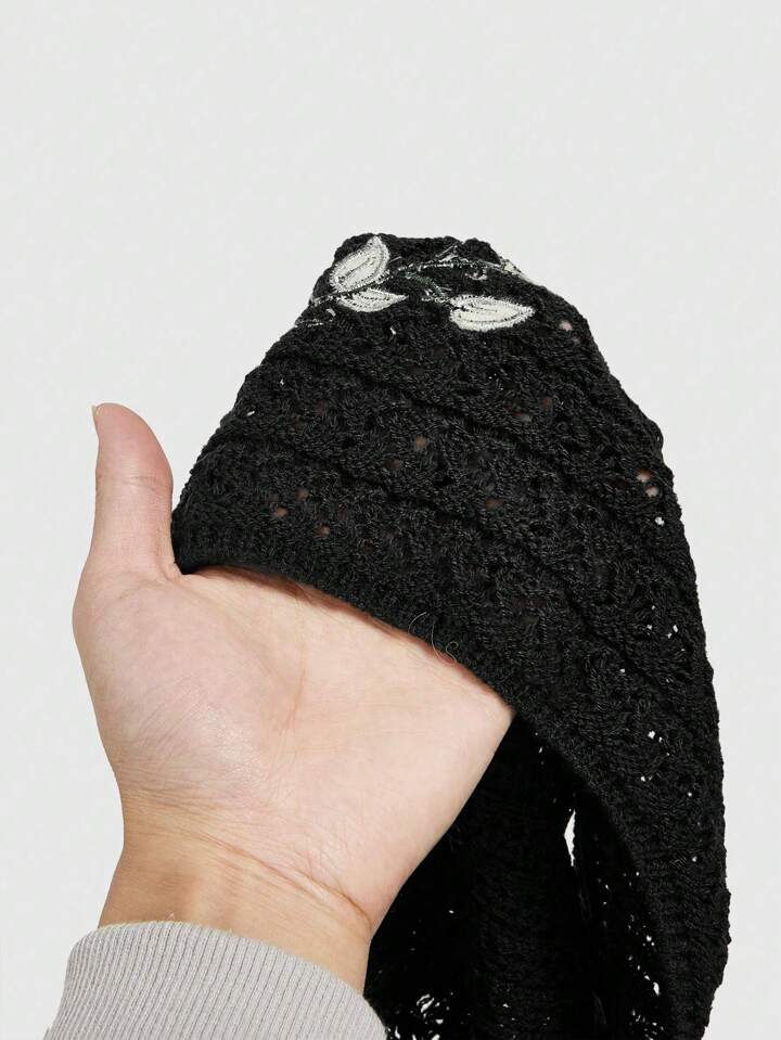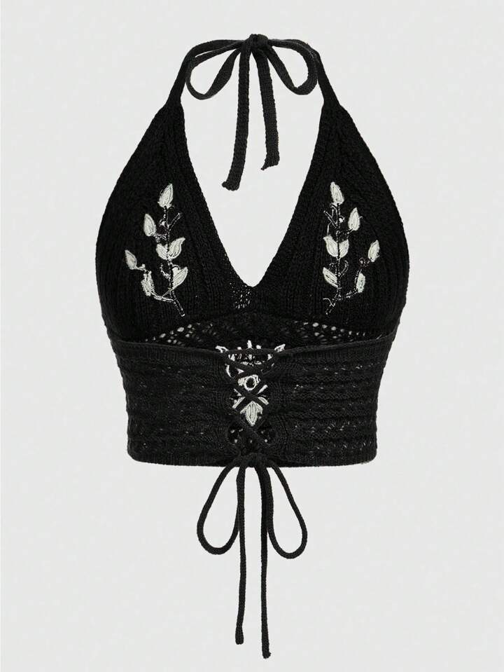 Fairycore Top de punto para mujer con aplique de bordado de planta y detalle calado hecho a mano para el verano, con tiras de amarre trasero al cuello