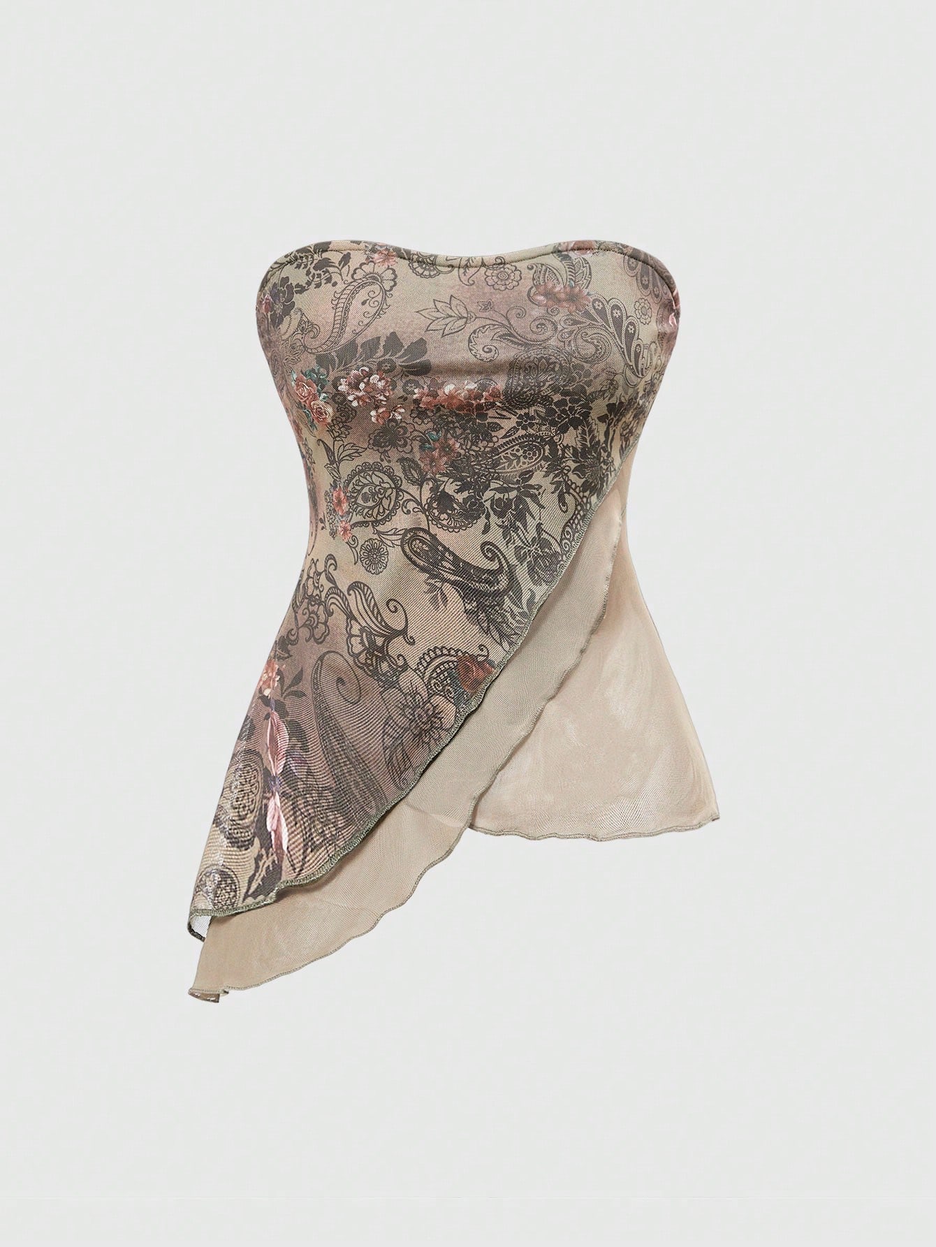 Fairycore Top bustier de mujer con estampado de paisley bohemio, parches de malla y bajo asimétrico para vacaciones de verano