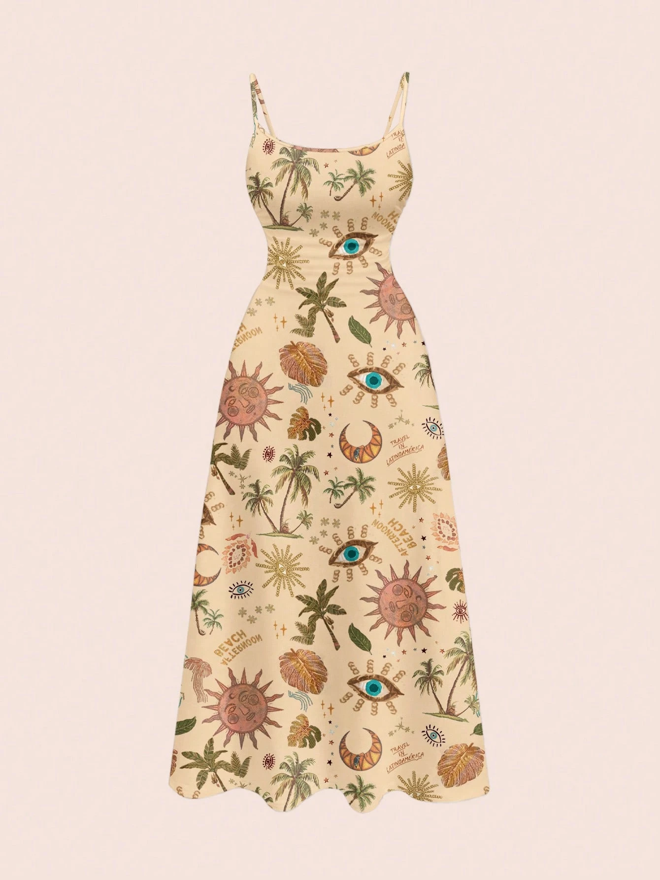 Fairycore Vestido de mujer con cuello en V fruncido, estilo hippie de vacaciones con estampado de palma