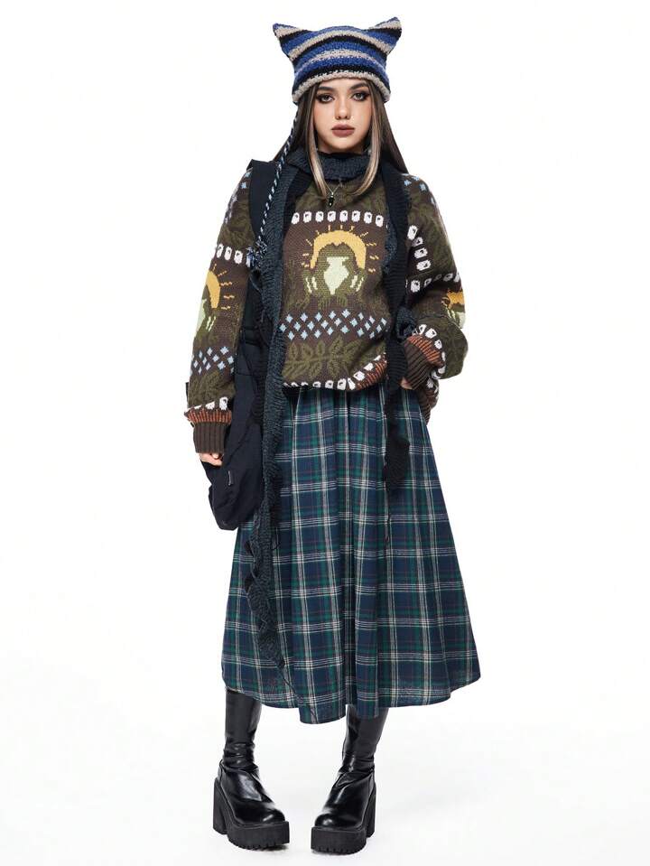 Falda con abertura en la Bottom, con botones frontales y estampado de cuadros en estilo vintage fairycore para mujeres