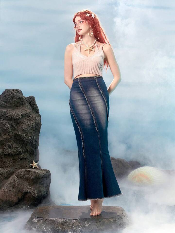 Fairycore Falda en mezclilla con lavado bajo sirena