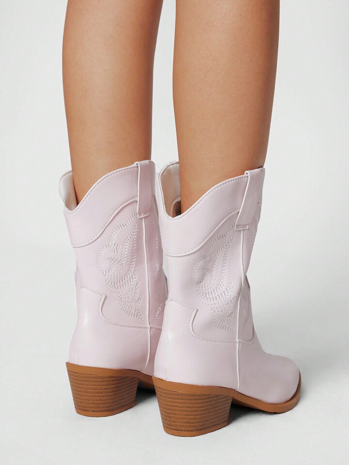 Fairycore Botas occidentales rosas para mujer, botas bordadas con punta afilada, corte en V, tacón grueso, zuecos de tacón bajo, botas de montar de cordón y botines