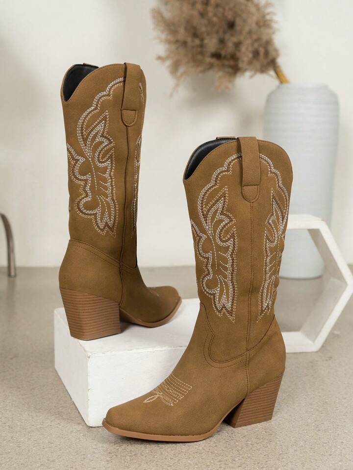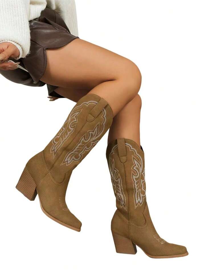 Fairycore Botas occidentales altas hasta el tobillo con bordado, de estilo informal y casual para mujer, nueva colección Primavera/Otoño 2024, color marrón otoñal