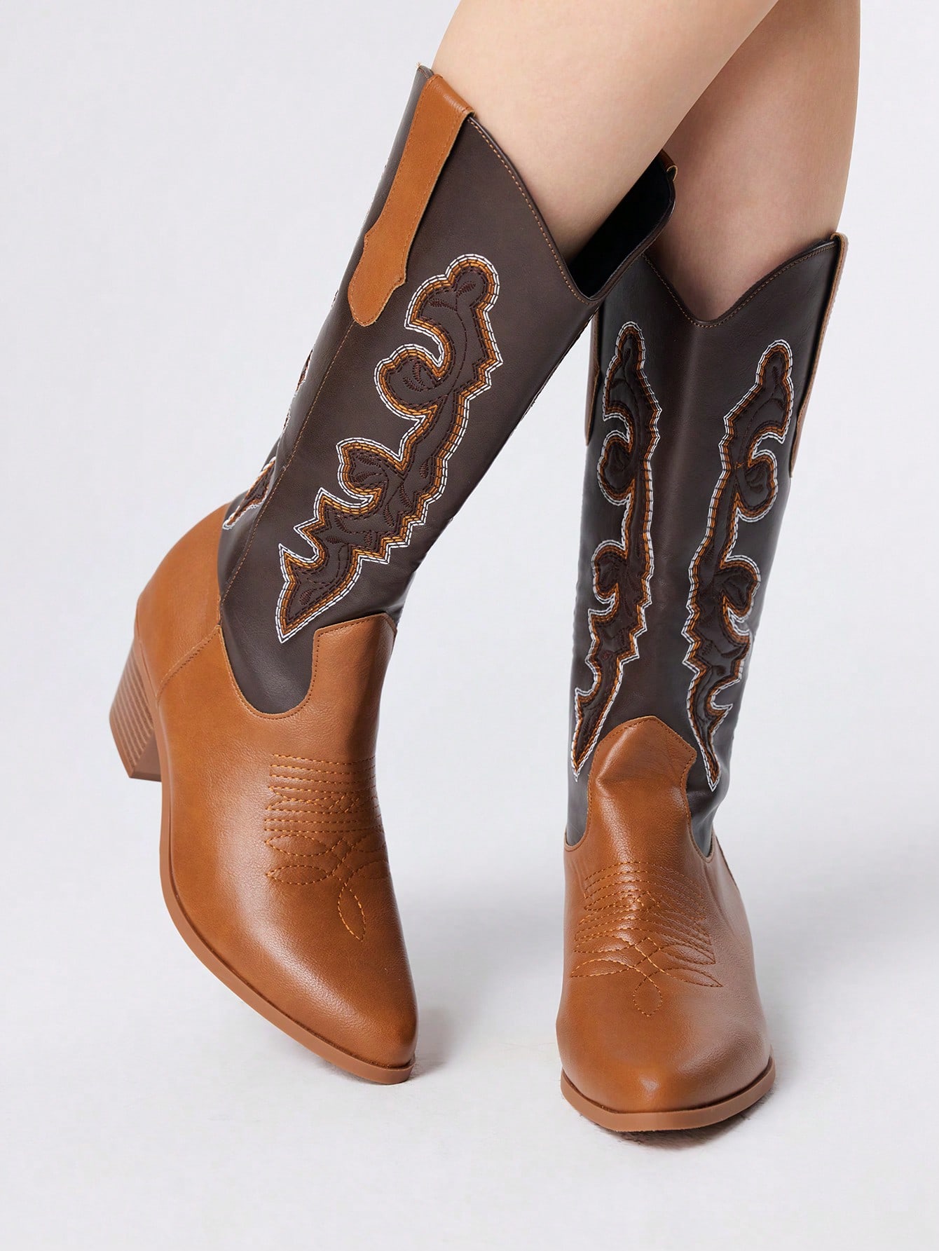 Fairycore Botas occidentales con punta puntiaguda y tacón grueso, bordadas, de mujer, de moda para primavera/otoño en color negro