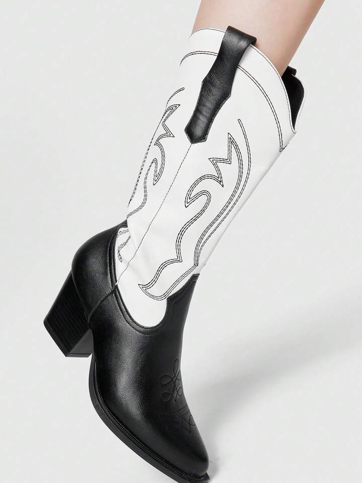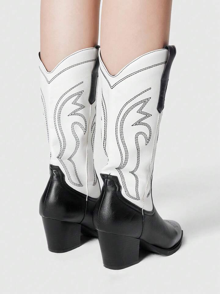 Fairycore Botas vaqueras de tacón grueso de media pantorrilla con punta puntiaguda y bordado, estilo clásico, para mujer